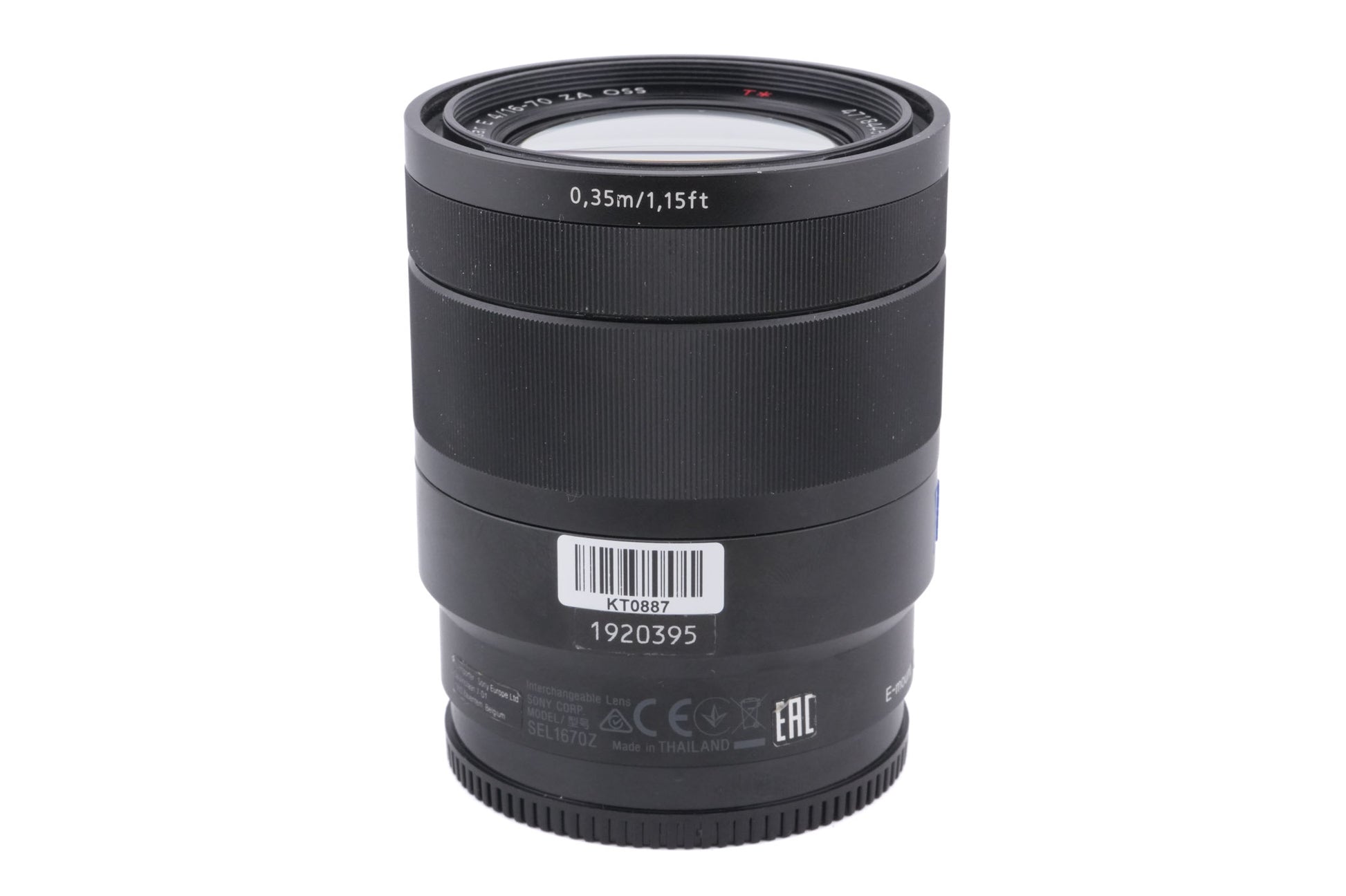 Autofocus normal zoom lens made for E-mount digital mirrorless cameras by Carl Zeiss starting in 2013. It is designed for APS-C-sized sensors and gives the equivalent field of view to a 24-105mm lens on full frame/35mm. It has image stabilization (OSS). The product code is SEL1670Z. Metal and plastic body available in black.