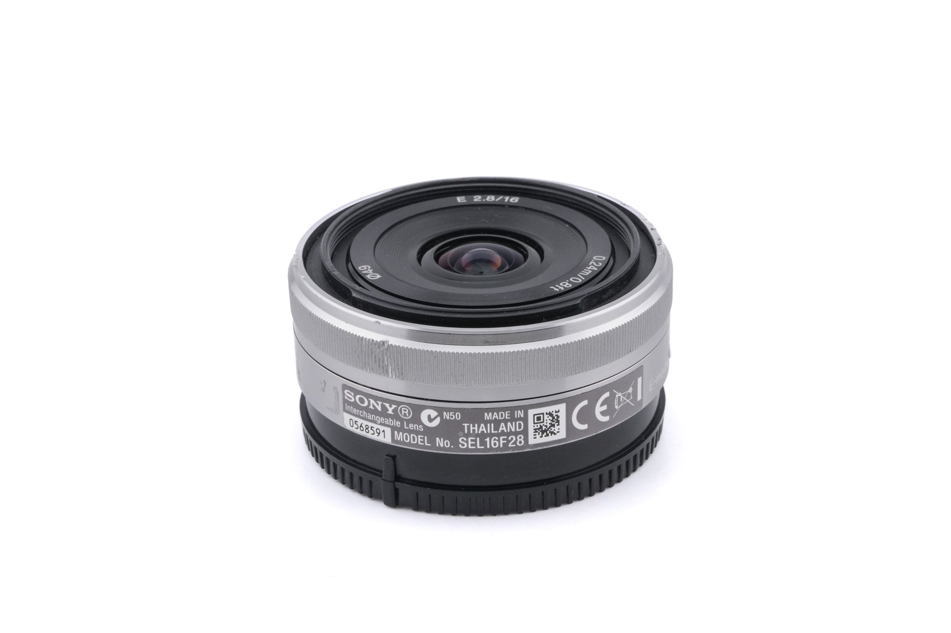 Autofocus wide-angle lens made for E-mount mirrorless digital cameras by Sony. The product code is SEL16F28. Plastic body available in silver.