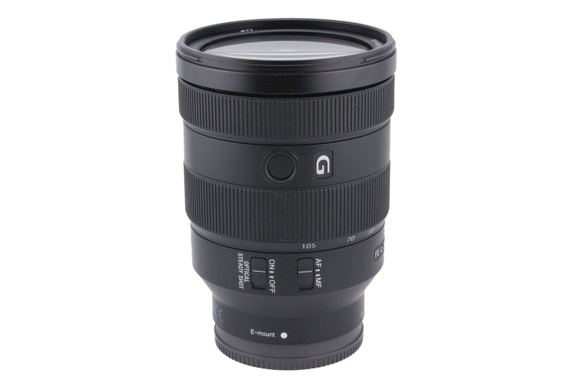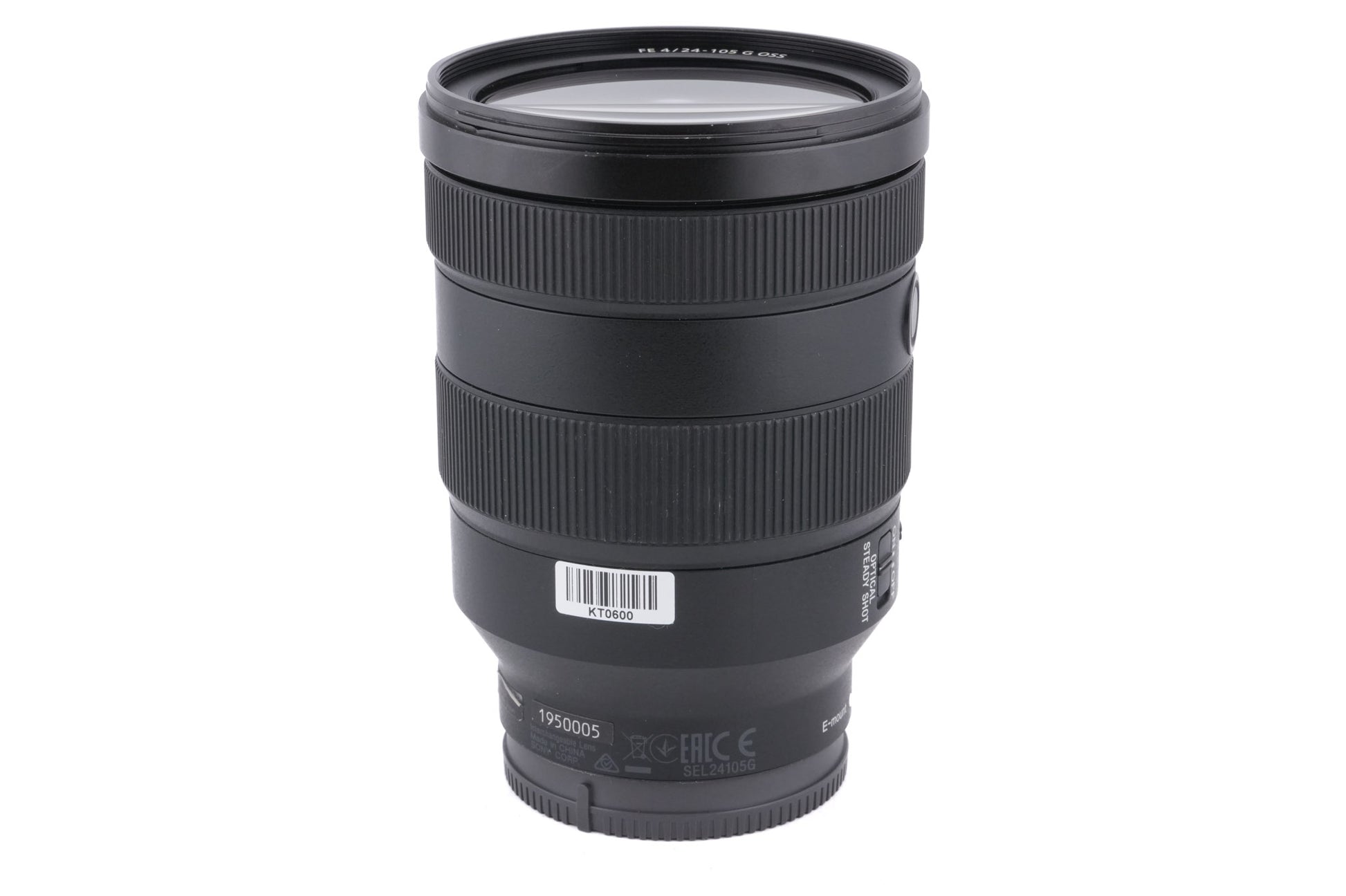 Autofocus normal lens made for FE-mount digital mirrorless cameras by Sony. It is lightly sealed against dust and moisture. The product code is SEL24105G. Metal and plastic body available in black.