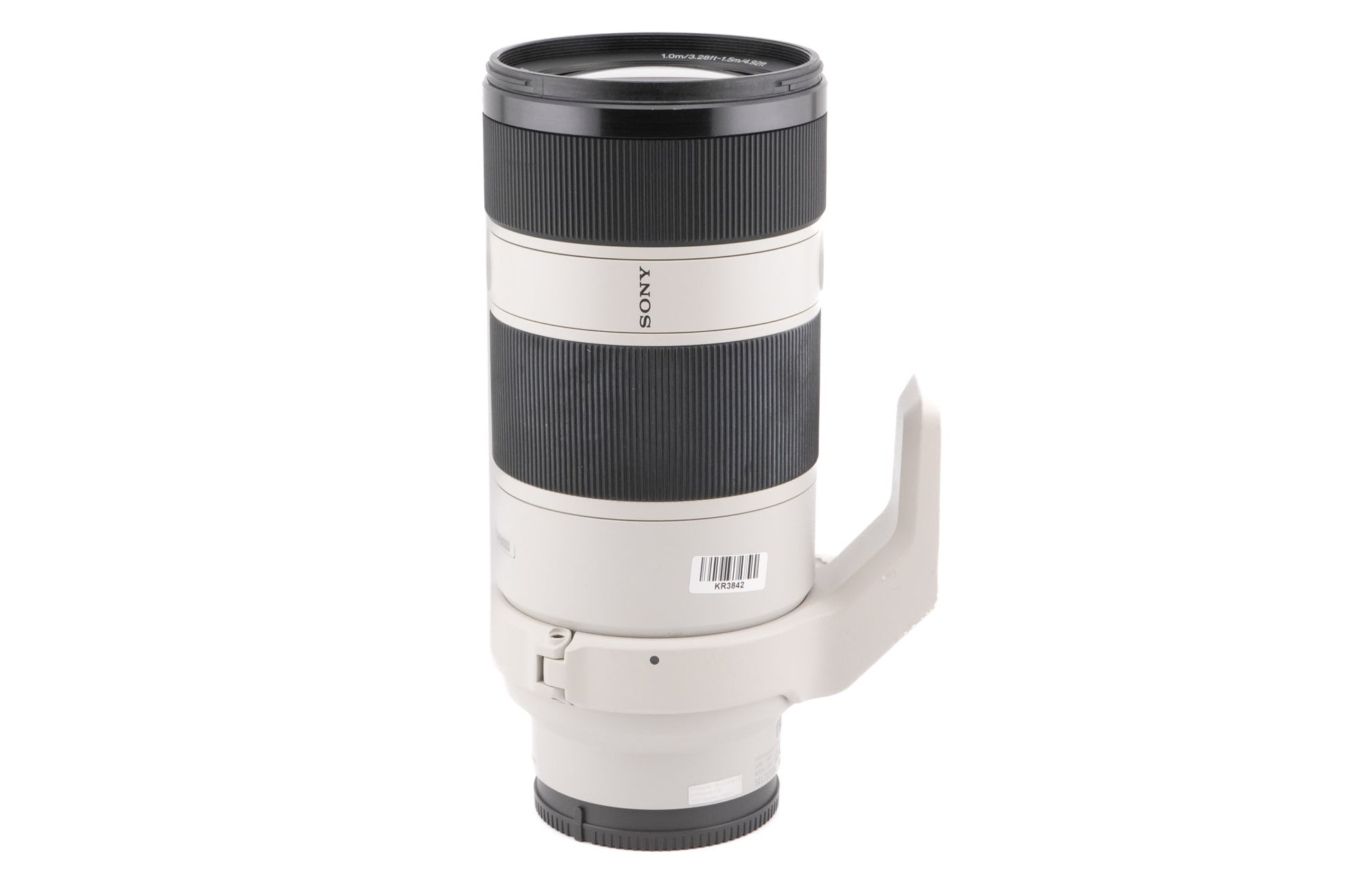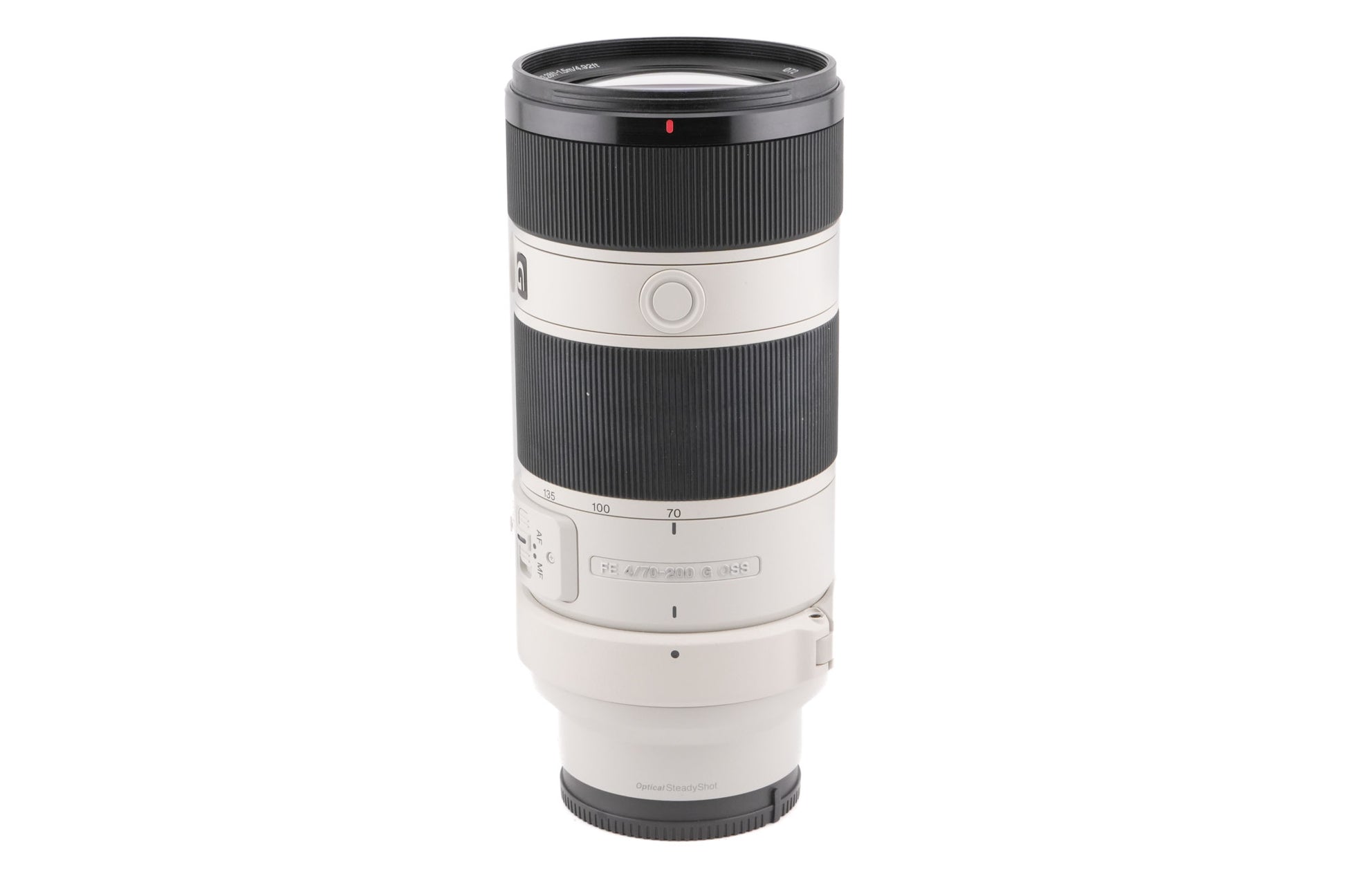 Autofocus telephoto zoom lens made for FE-mount digital mirrorless cameras by Sony. It has optical image stabilization (OSS), is dust and moisture-resistant, and has Nano AR coatings on the lens elements to reduce any unwanted flares or reflections. The product code is SEL70200G. Metal and plastic body available in white.