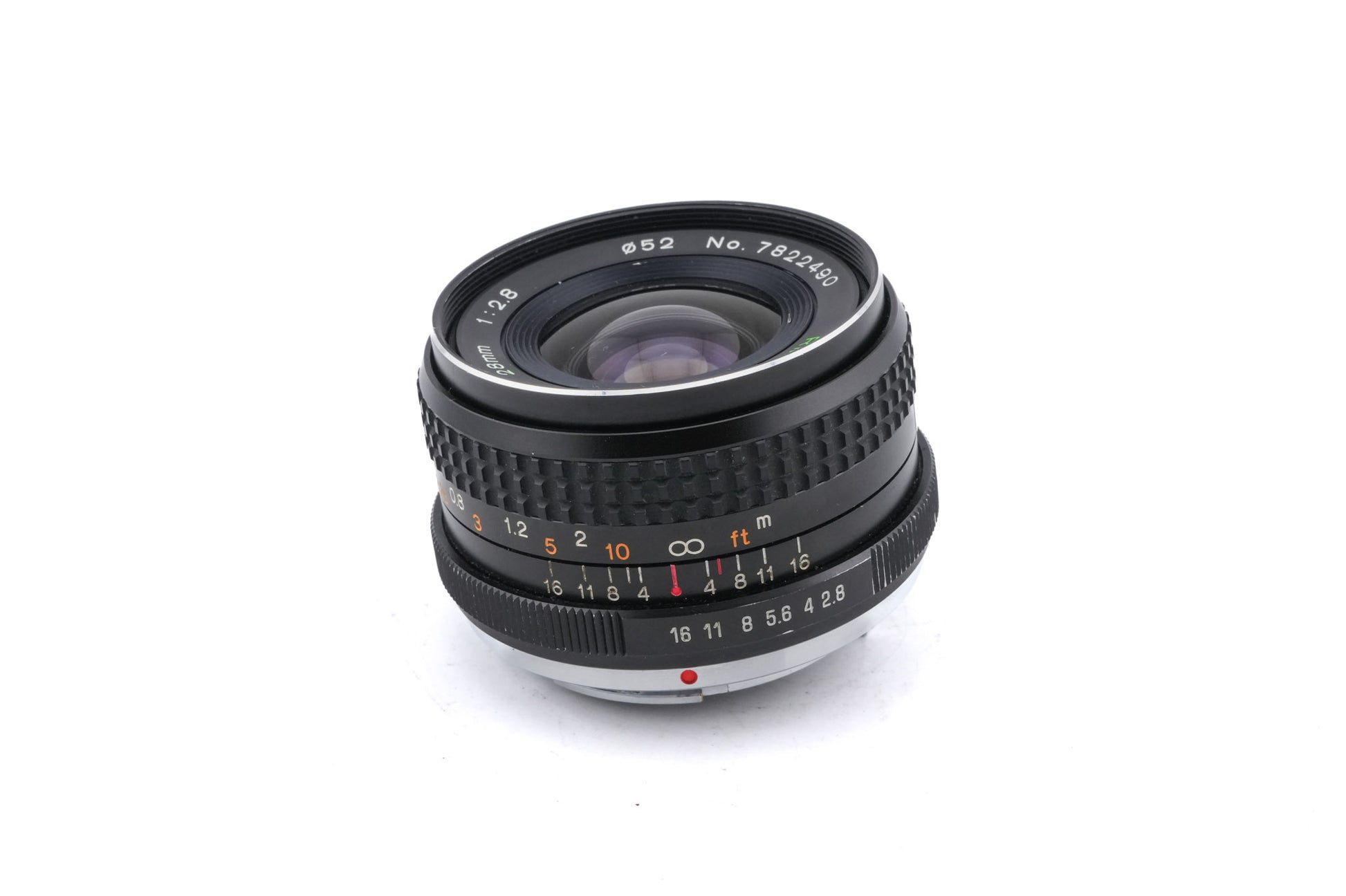 Manual focus wide-angle lens made for K-mount 35mm SLR cameras by Tokina. Metal body available in black.