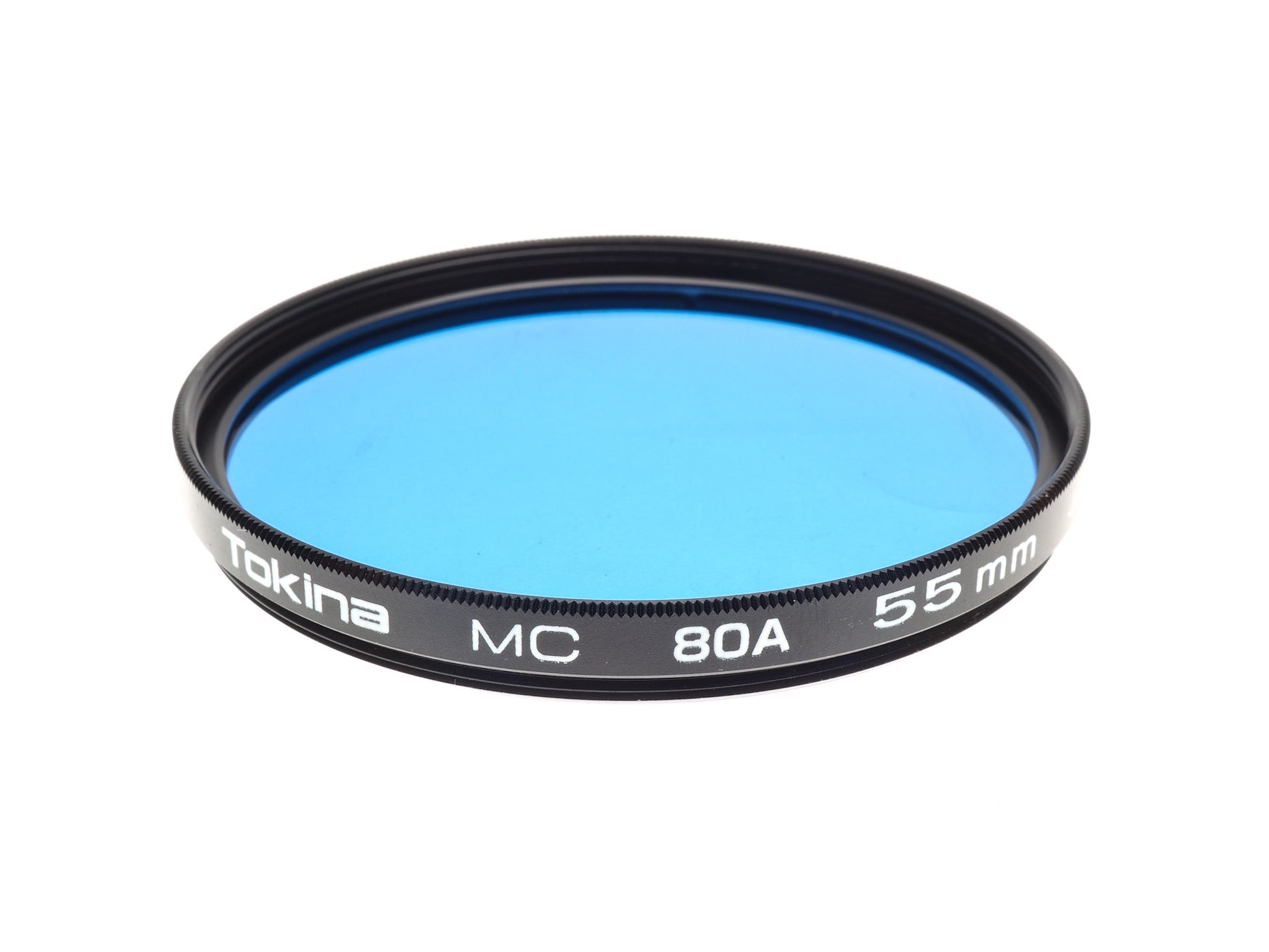 80A light balancing filter made by Tokina for all lenses with 55mm filter threads. Helps correct strong yellow/red casts in images with daylight-balanced film. Black metal body.
