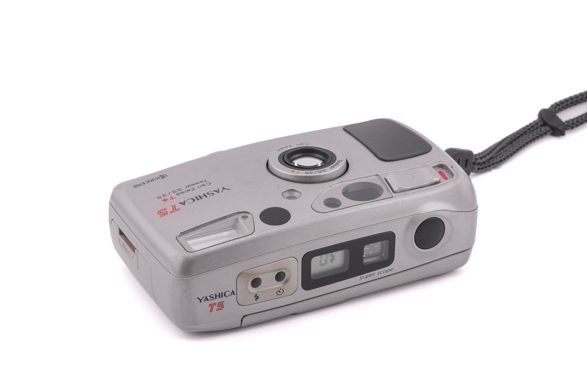 Autofocus 35mm compact camera released by Yashica in the 1990s. It features a waist-level "Super Scope" finder, light weatherproofing, and a Carl Zeiss Tessar lens. Plastic body available in silver & black.