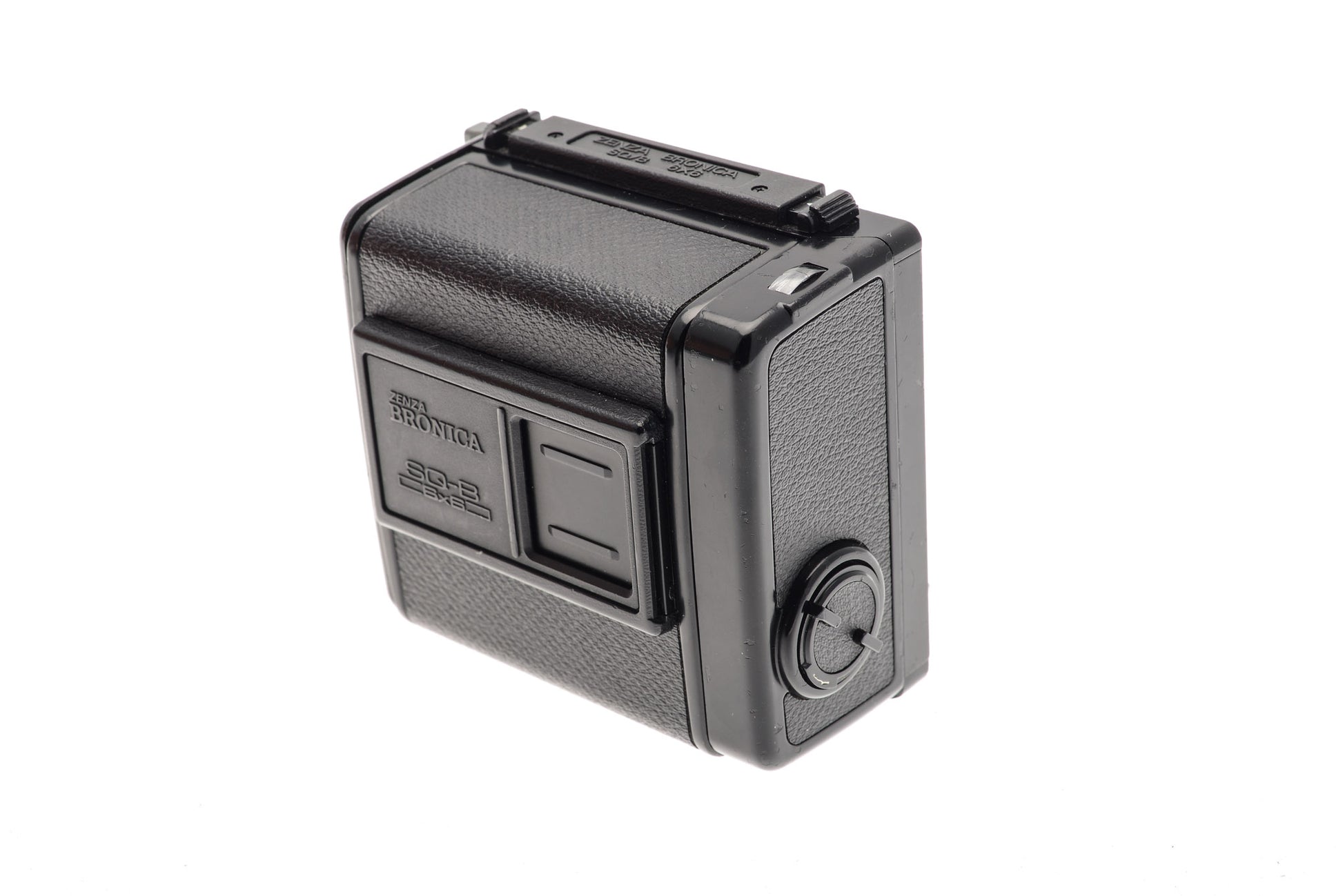 Film back made by Zenza Bronica for SQ mount 120 SLR cameras. Designed specifically for the SQ-B, this back lacks the electronic contacts and ISO dial of normal backs. All SQ models except the SQ-B will not meter properly with this back. Black plastic/metal body.
