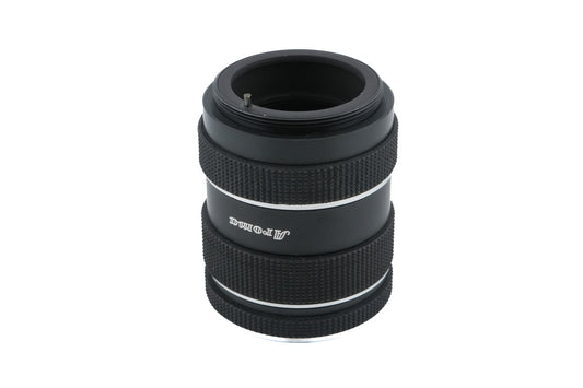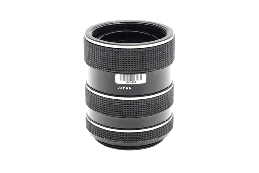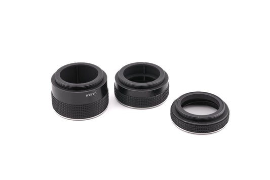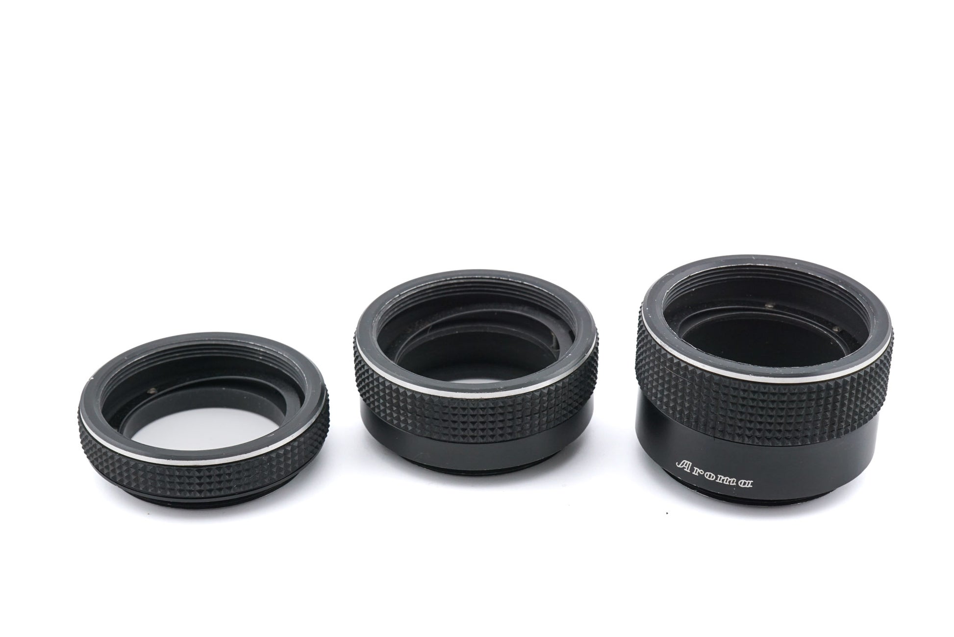 Set of 3 extension tubes made for M42 screw mount 35mm SLR cameras by Aroma. They have aperture-activation pins. Tubes are ~10, 18, and 28mm long. Black metal construction, with rubber grips and silver rings near the edges.