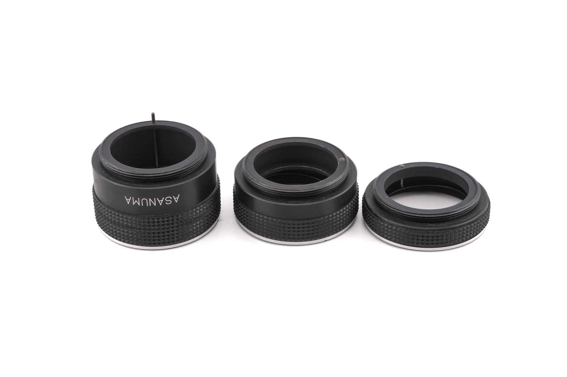 Set of 3 extension tubes by Asanuma for 35mm SLRs with M42 screw mount. They have an aperture-activation pin. Tubes are ~10, 18, and 28mm long. Black metal construction, with rubber grips and silver rings near the edges.