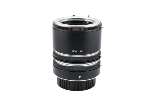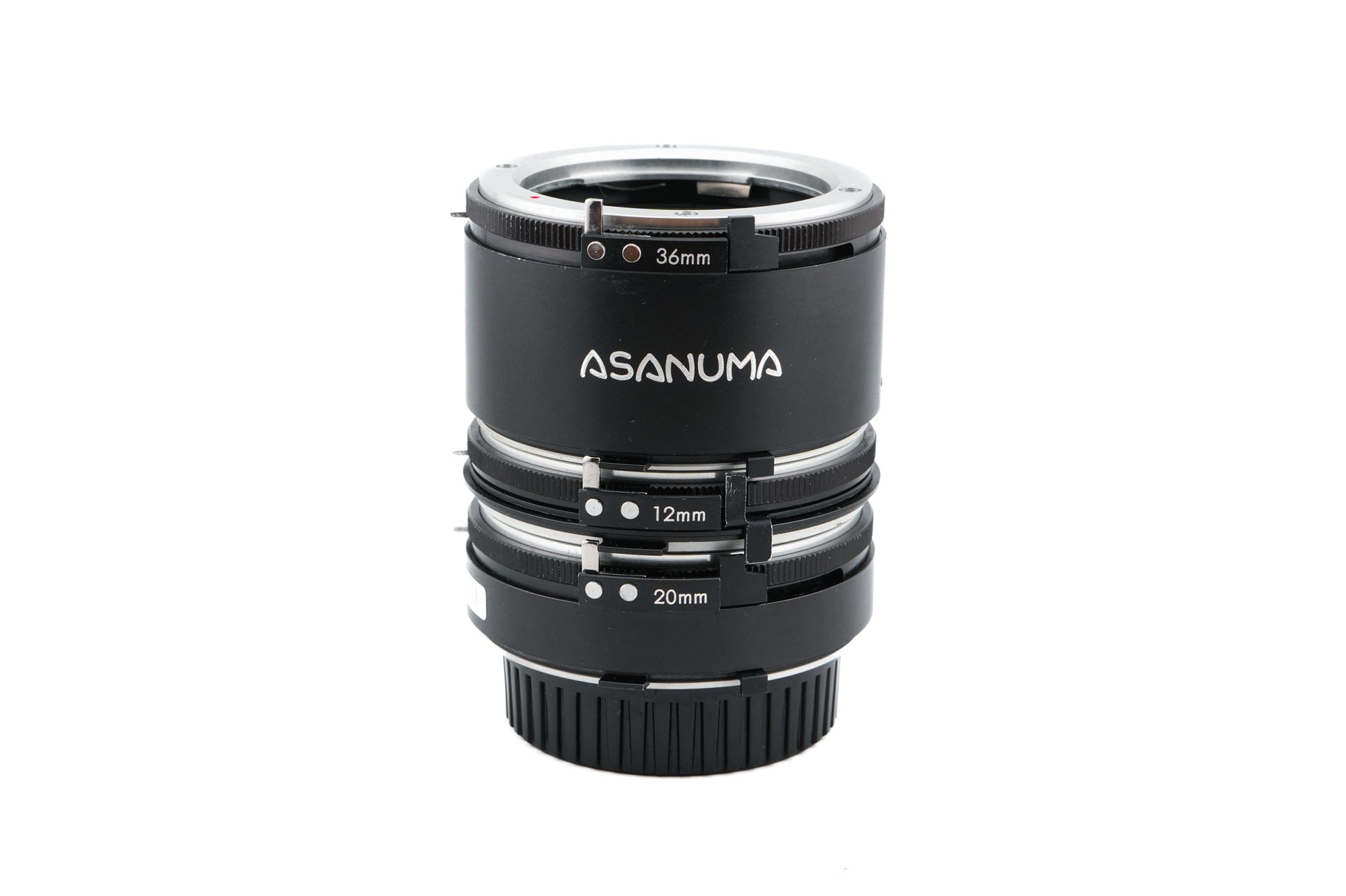 Set of 3 extension tubes by Asanuma for 35mm SLRs with Minolta MD-mount. Has aperture-coupling. Black/Silver metal construction.