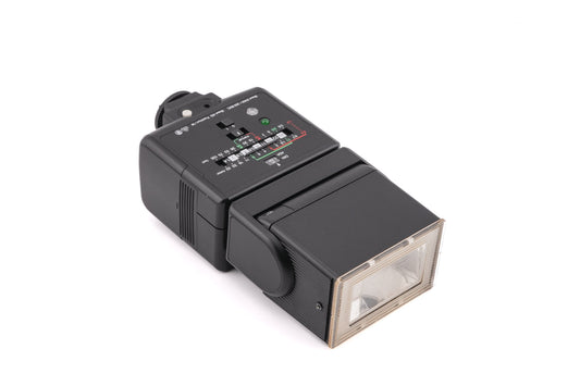 Hotshoue mounted flash made by Braun. It has a single contact pin. Plastic body available in black.