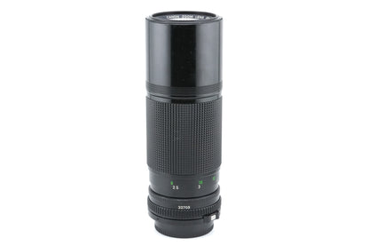 Manual focus push-pull zoom lens made for Canon FD mount by Canon introduced in 1979. Has a built-in lens hood and in-between aperture stops. Metal and plastic body available in black.