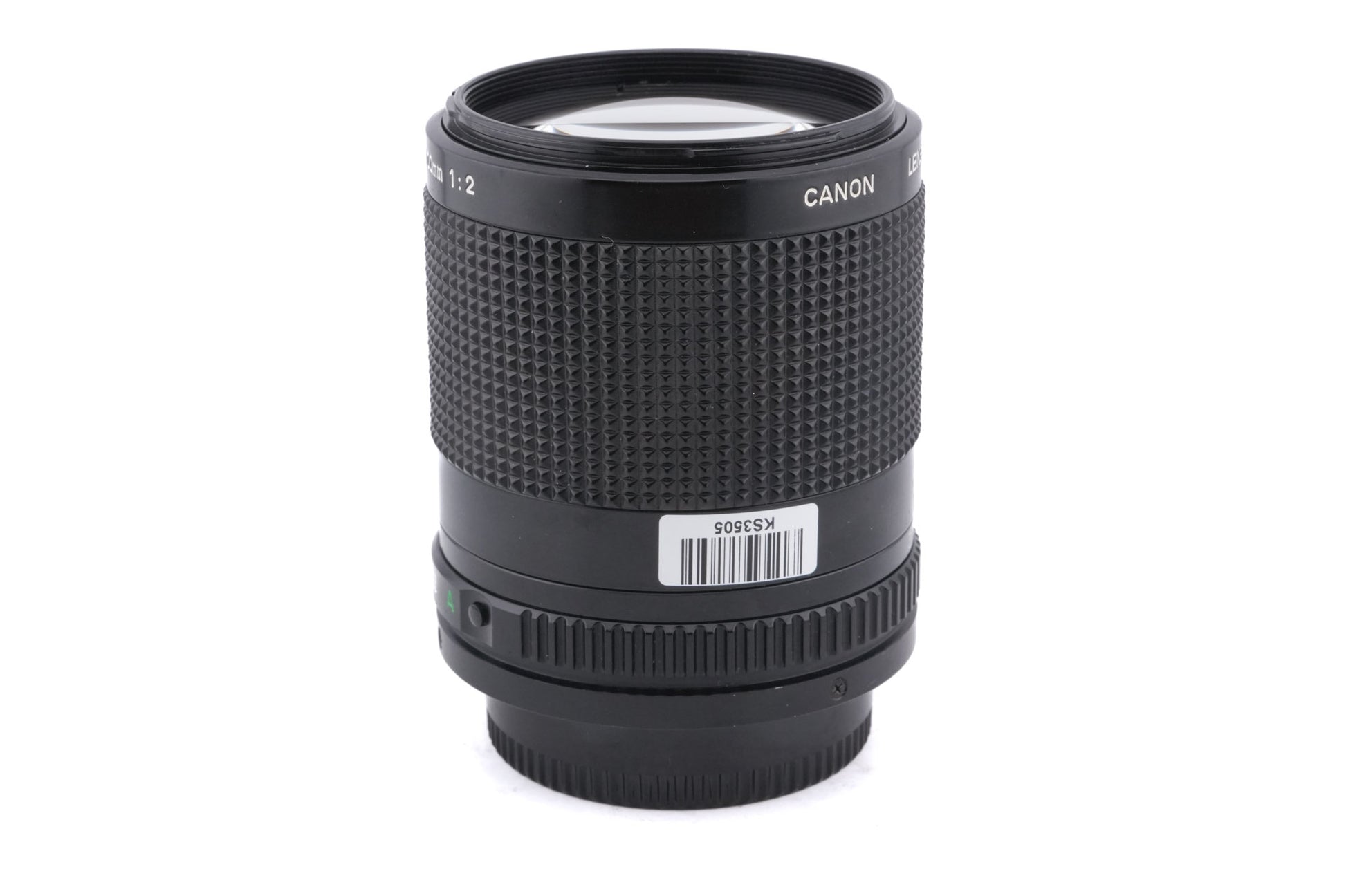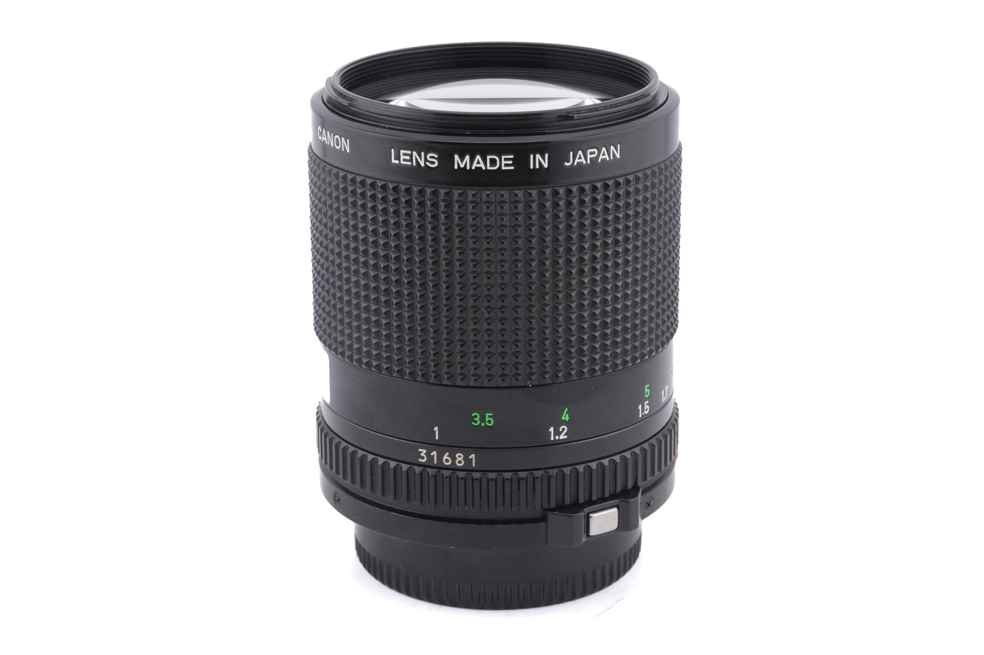 Manual focus telephoto lens made for FD-mount 35mm SLR cameras by Canon. The original price back in 1980 was 63500¥ which is roughly 592€ in todays value. Metal and plastic body available in black.