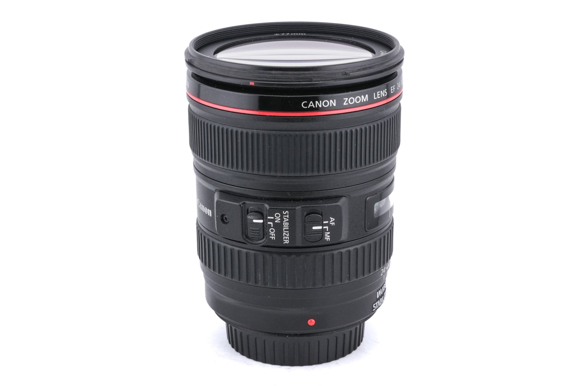 Autofocus standard zoom lens made for EF-mount SLR cameras by Canon starting in 2005. It's part of their L series of professional lenses and has a weather-sealing gasket. It has built-in image stabilization (IS) and uses an ultrasonic motor (USM) for autofocus. Plastic and metal body available in black.