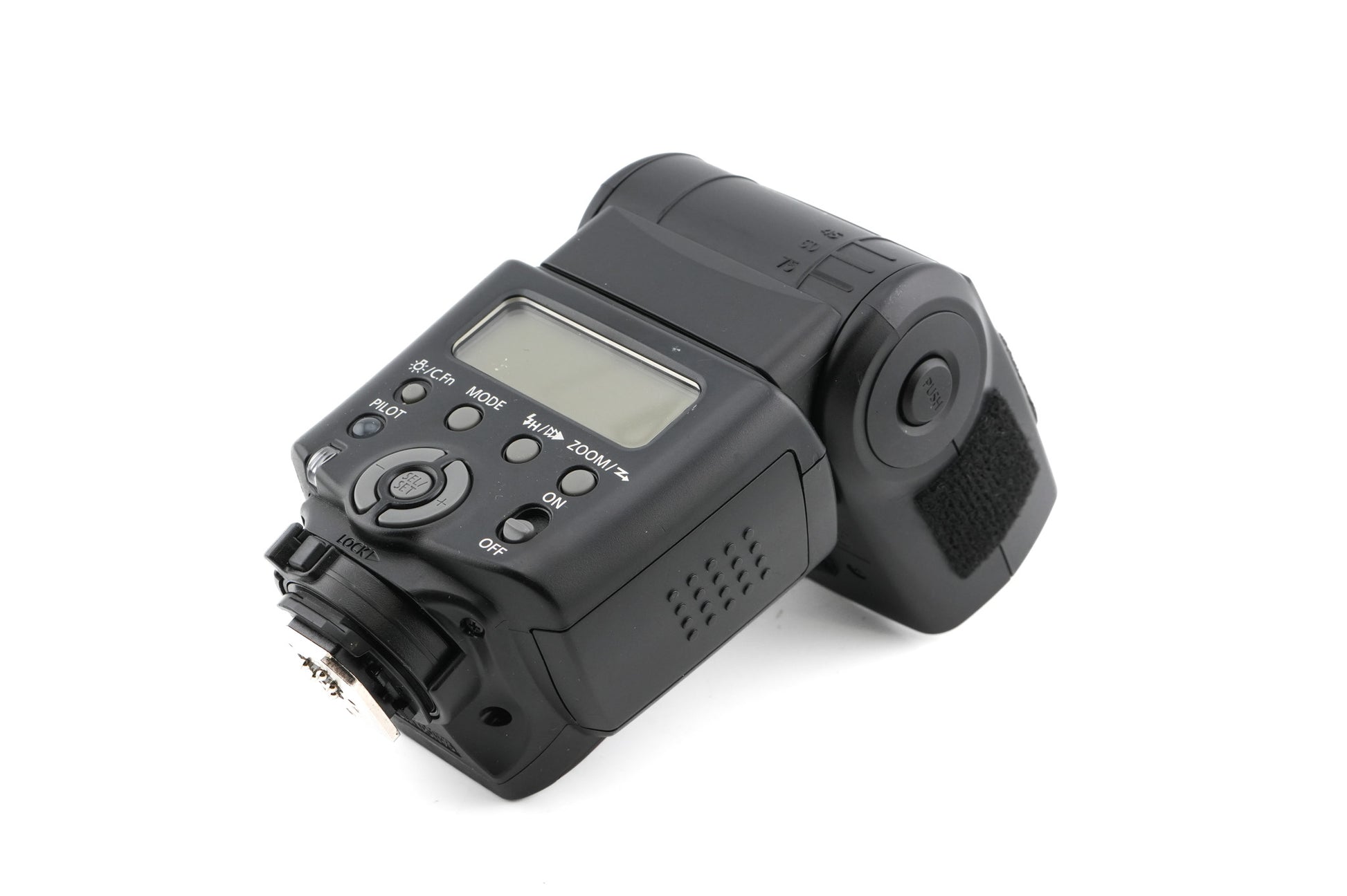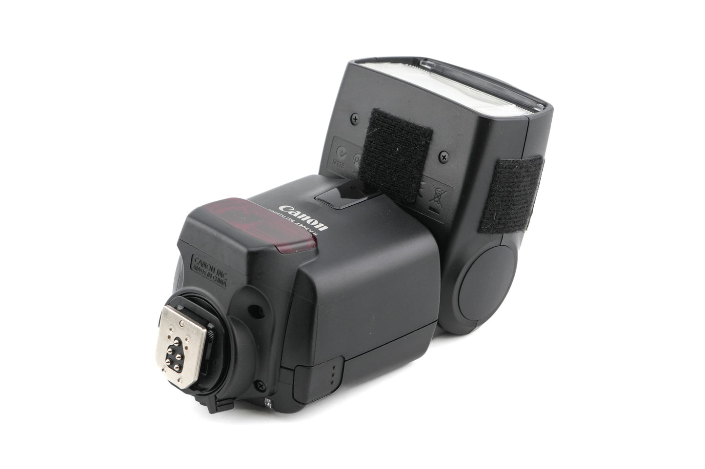 Flash made for EF-mount (D)SLR cameras by Canon. It is capable of using Canon's E-TTL II flash metering system. It has built-in wireless receiver technology and a zooming flash head that covers 24-105mm lenses. The flash head tilts 90º and rotates 180º. Plastic body available in black.