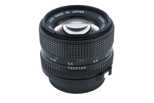 Manual focus normal lens for FD-mount 35mm SLRs by Canon. Intended for low-light photography. Uses Canon's newer locking FDn mount, without the external breech lock and with newer coatings. Metal/plastic body available in black.