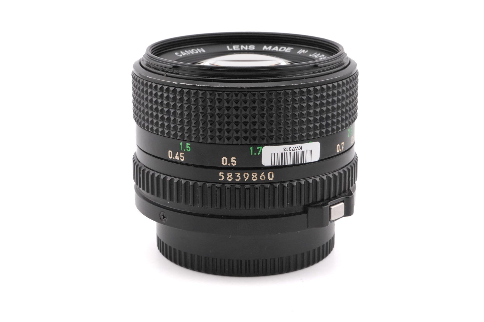 Manual focus normal lens for FD-mount 35mm SLRs by Canon. Intended for low-light photography. Uses Canon's newer locking FDn mount, without the external breech lock and with newer coatings. Metal/plastic body available in black.