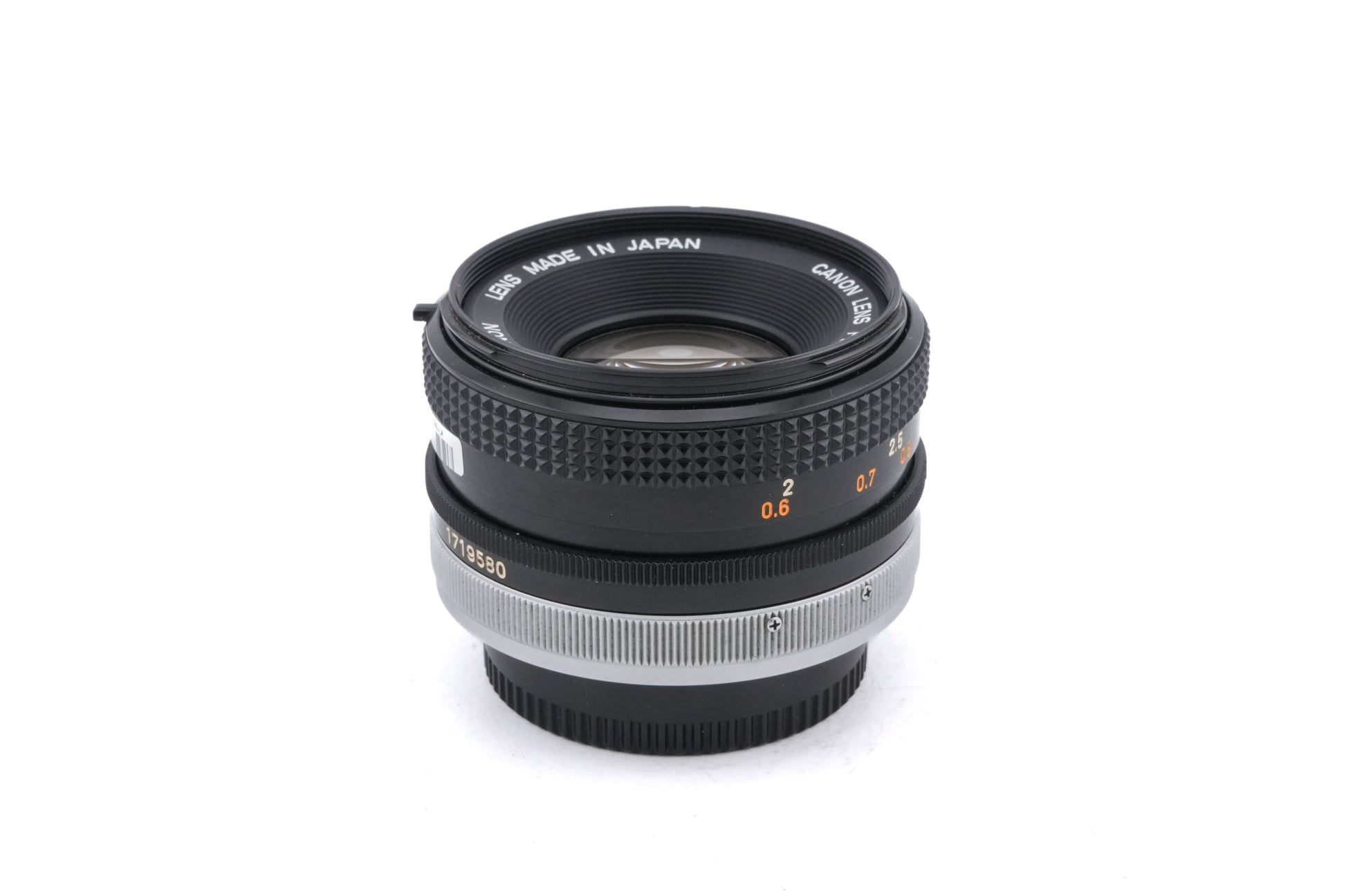 Manual focus normal lens made for FD-mount 35mm SLR cameras introduced by Canon in 1973. Earlier versions have metal aperture rings and a green "O" for the automatic mode, whereas later models use plastic rings and a green "A". The original price (16,500 Yen) is equal to ~290 Euros in 2023. Metal/plastic body available in black.