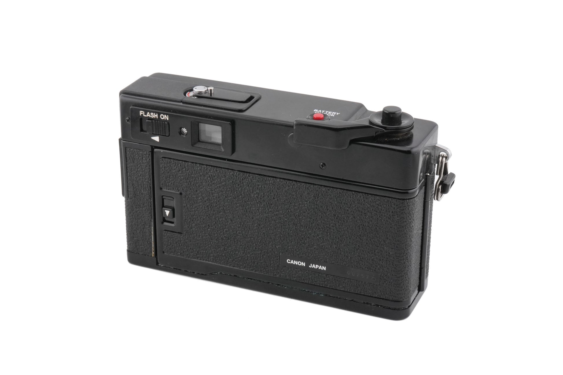 Manual focus rangefinder camera introduced by Canon in 1977. It uses two 1.35v H-D mercury batteries for the shutter/light meter and one 1.5v AA battery for the flash. Metal and plastic body available in black.