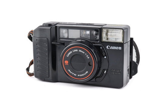 Autofocus 35mm point-and-shoot camera released by Canon in 1983. It has a manual ISO dial, so basic exposure compensation is possible. It was also sold as the Autoboy 2 (JP) and New Sure Shot (NA). The original price (42,800 Yen) is the equivalent of around 360 Euros in 2025. Plastic body available in black.