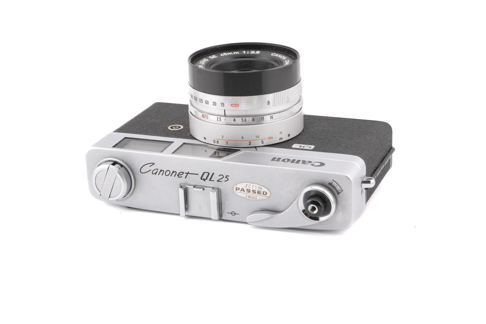 Maunal focus rangefinder camera made by Canon. Older style Canonet body, sold with slower f2.5 lens to cut costs. Other areas of cost-cutting include a restricted minimum shutter speed of 1/15th and the use of a cold shoe with x-sync port rather than a hot shoe flash. Has Canon's quick loading (QL) system. Metal body available in silver.