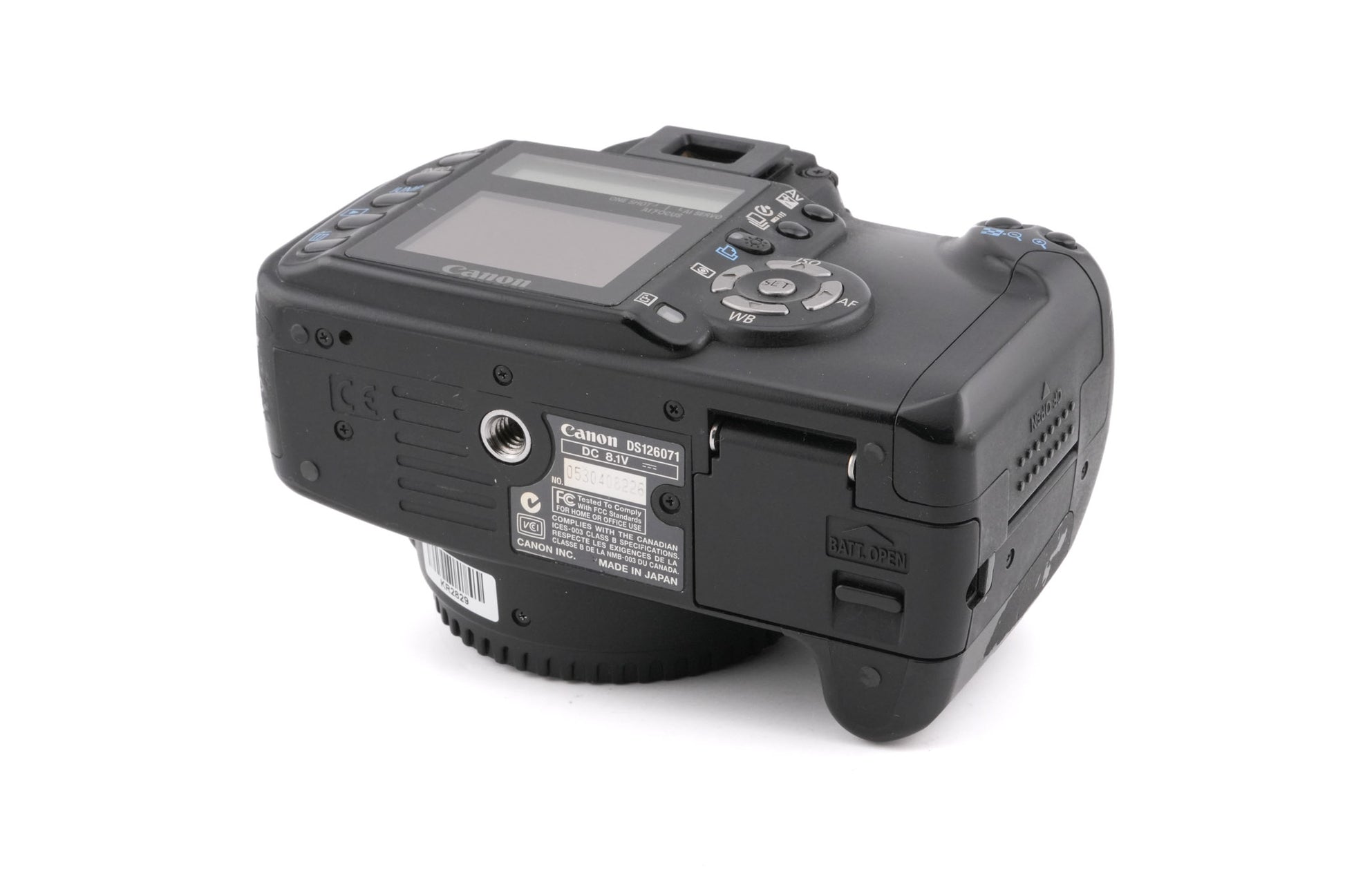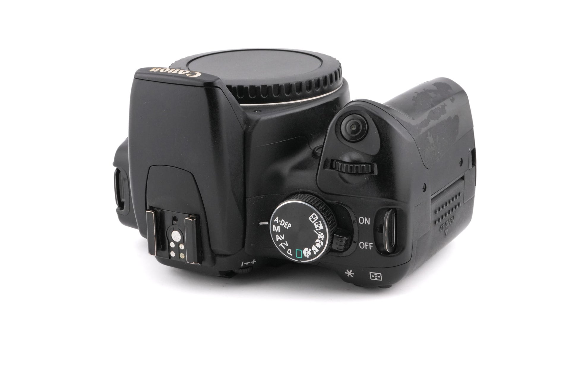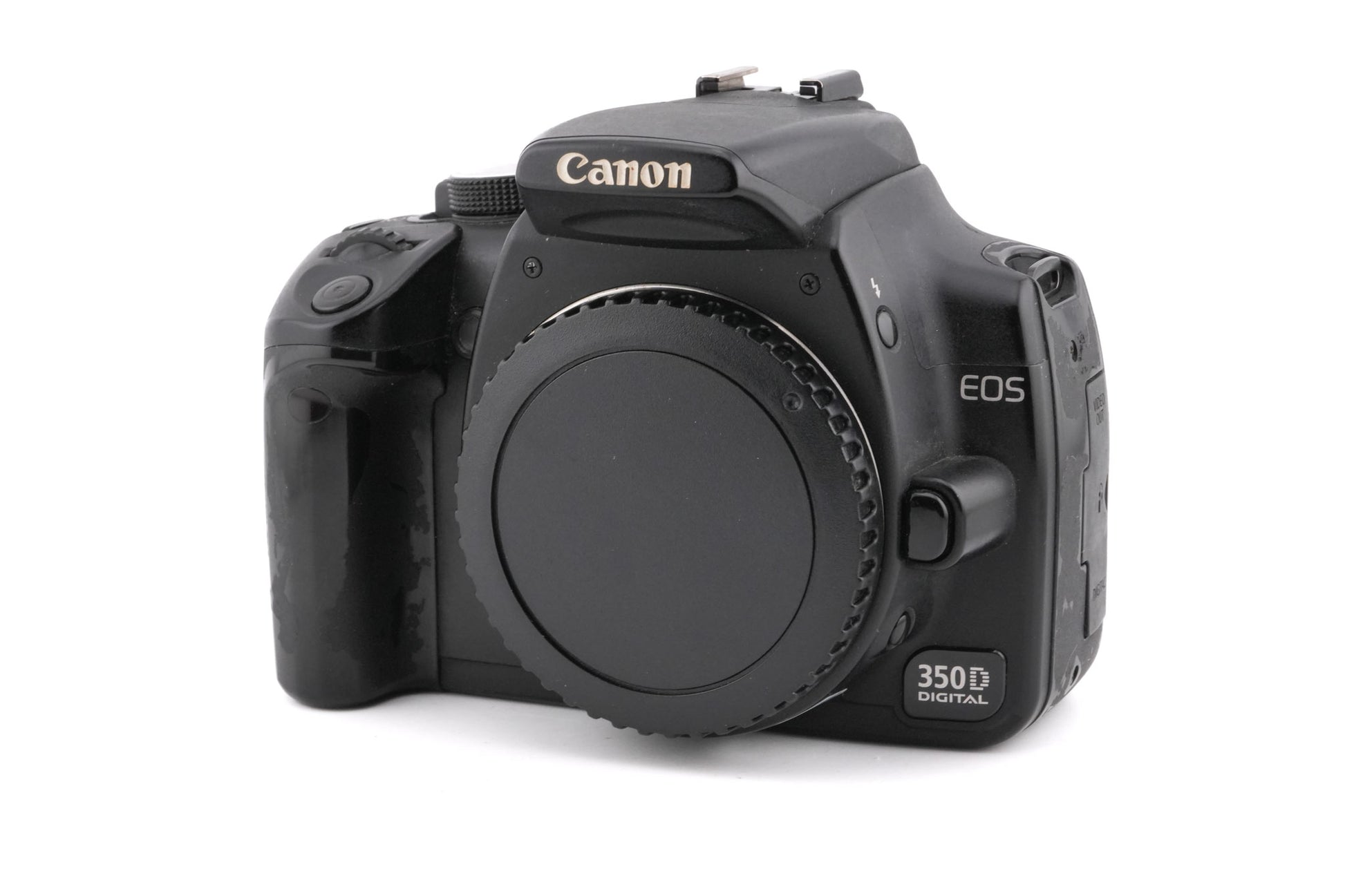 Autofocus EF-S-mount DSLR camera released by Canon in 2005. It is also known as the Rebel XT (NA) and Kiss N (JP). It uses CompactFlash memory card. Plastic body available in black & silver.