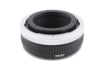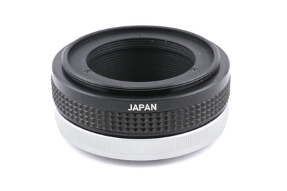 Reverse mount helicoid adapter for lenses with 55mm filter mount made by Canon. Can be extended to 13mm. It can be attached directly to the Extension Tube M, the Bellows FL, and the camera body. Besides, when attaching it only to the standard lens, it is capable of magnifications of 1.3X to 1.5X and is indeed very useful. The 55mm Macrophoto Coupler is designed for use with the standard FD 50mm F 1.4 and 1.8 lenses. Metal body available in black.