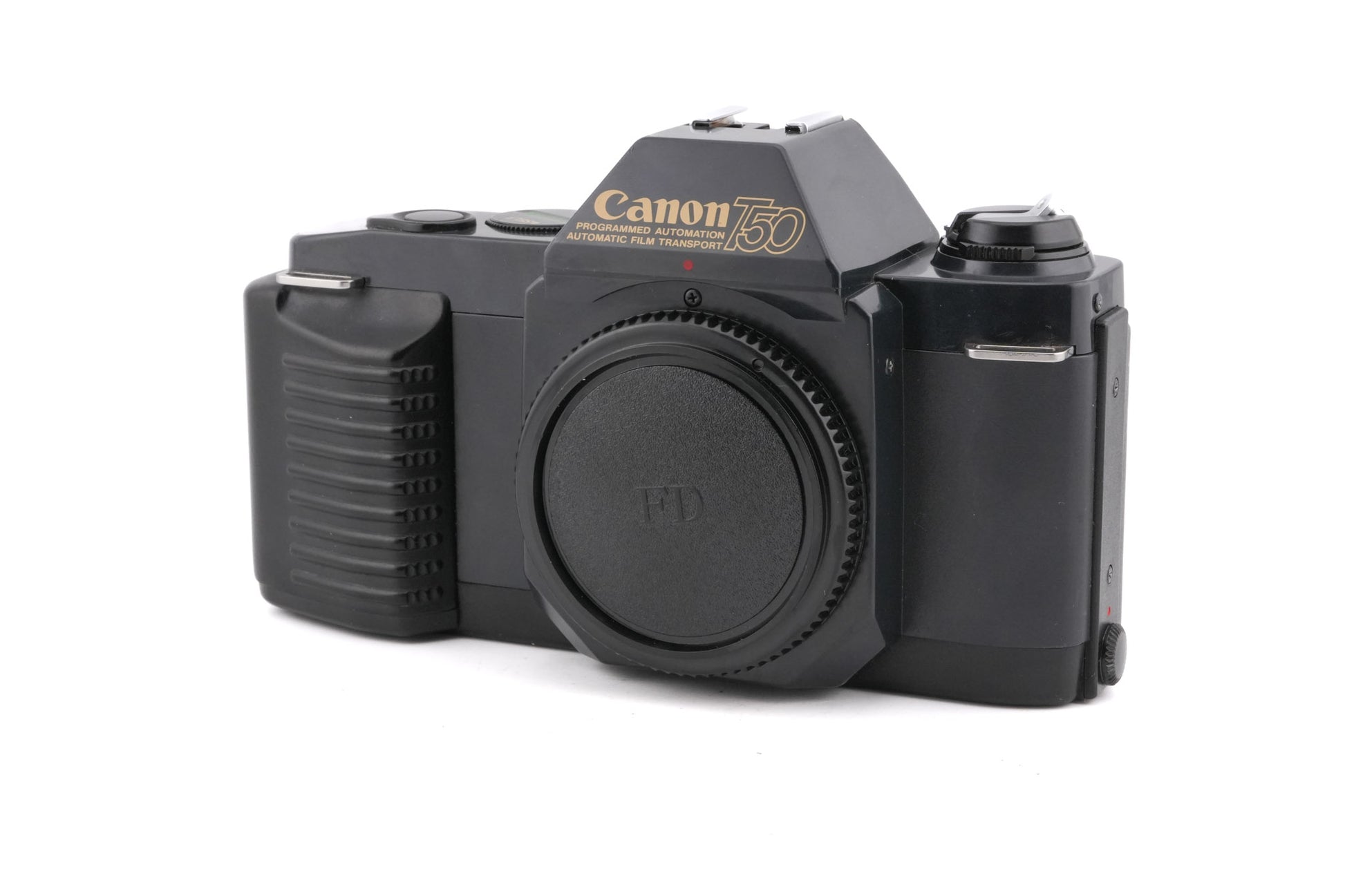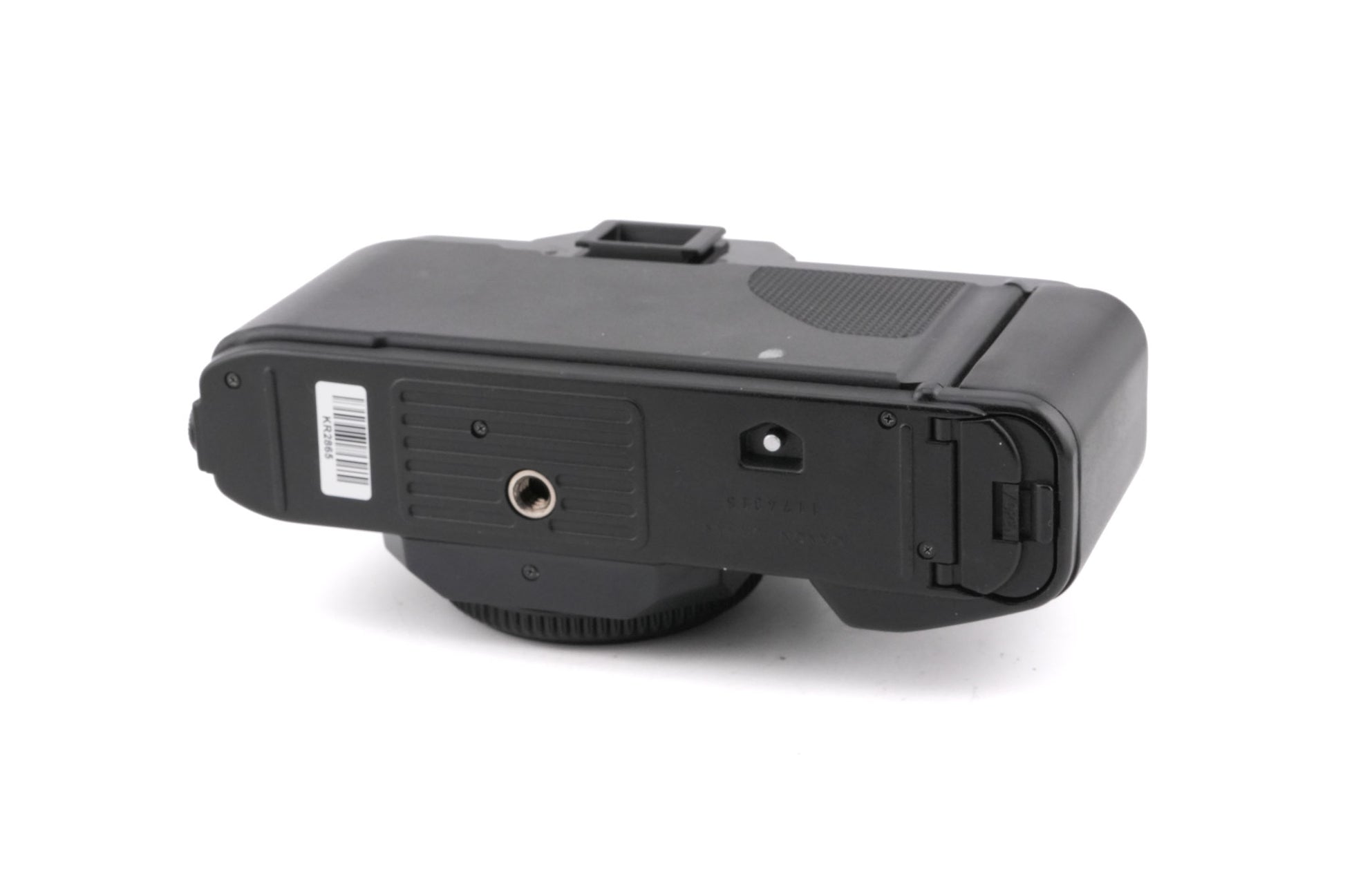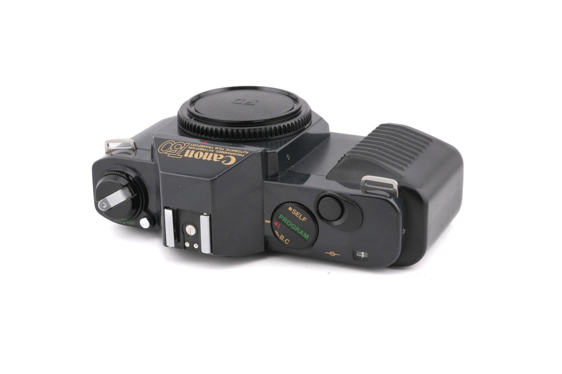 Manual focus FD-mount 35mm SLR camera released by Canon in 1983. This body is only capable of fully programmed autoexposure. Plastic body available in dark gray.
