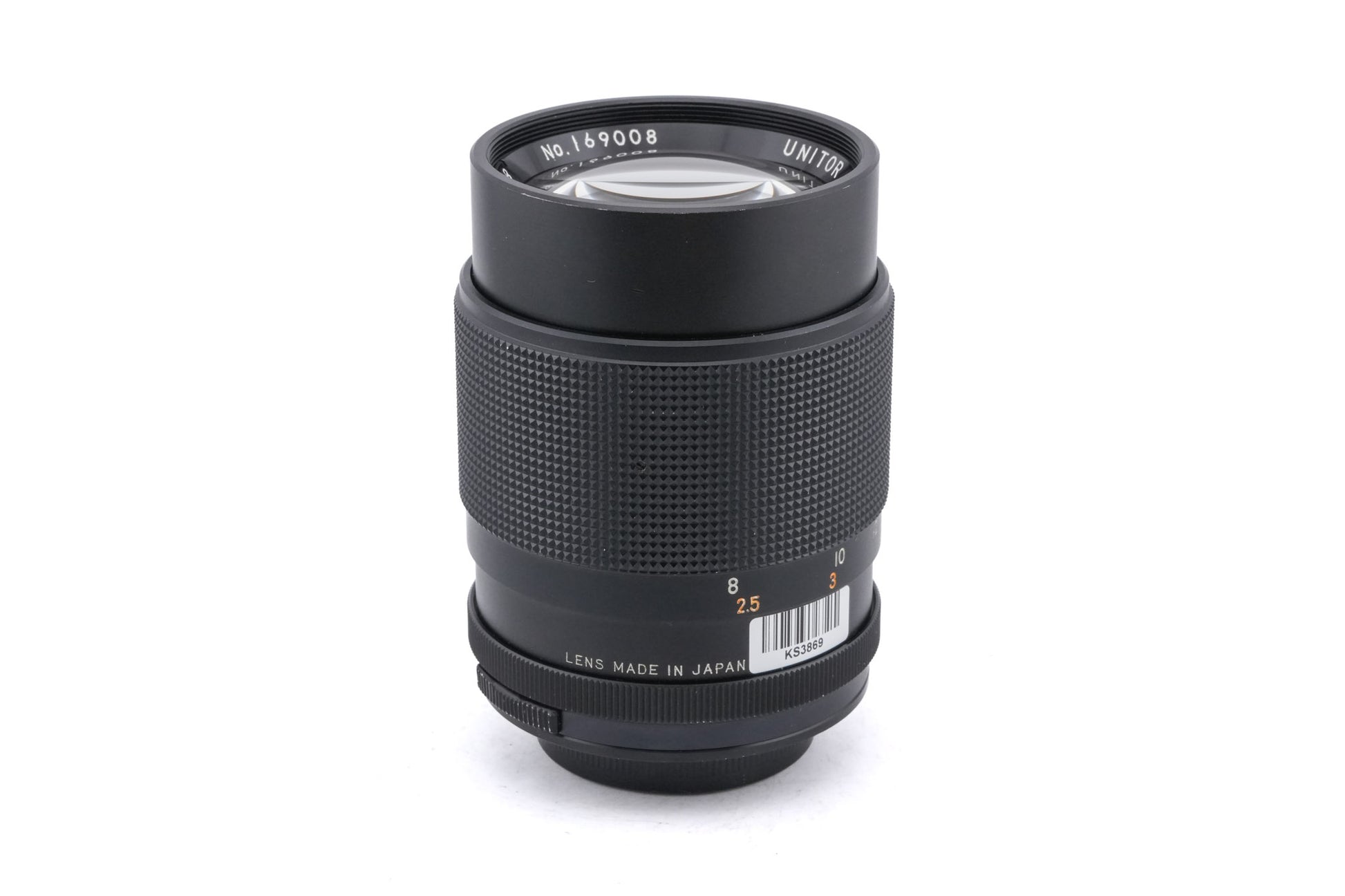 Manual focus telephoto lens made for M42 mount 35mm SLR cameras introduced by Chinon. It has an auto/manual aperture switch and in-between aperture stops. It also has a built-in lens hood. Metal body available in black.