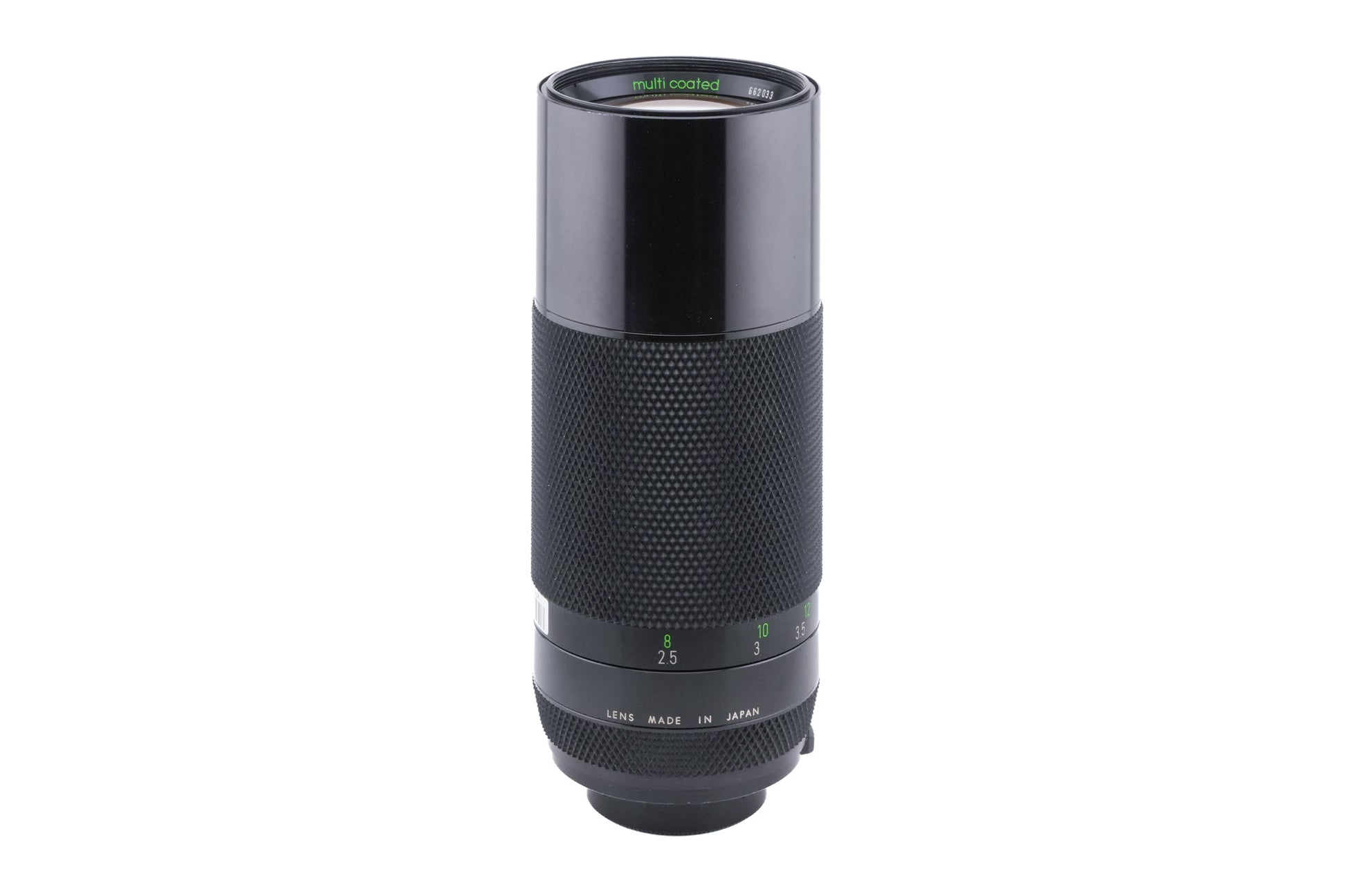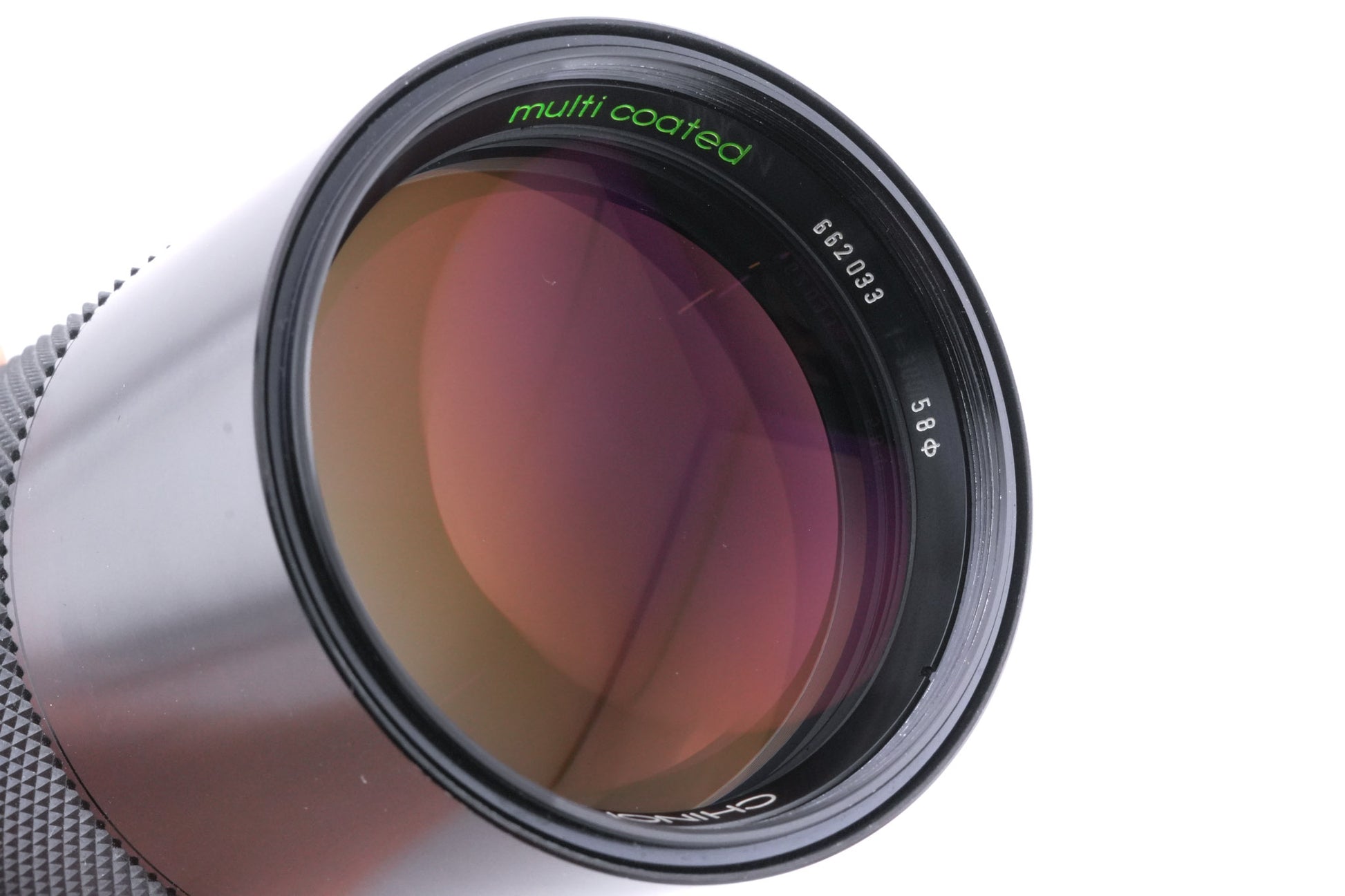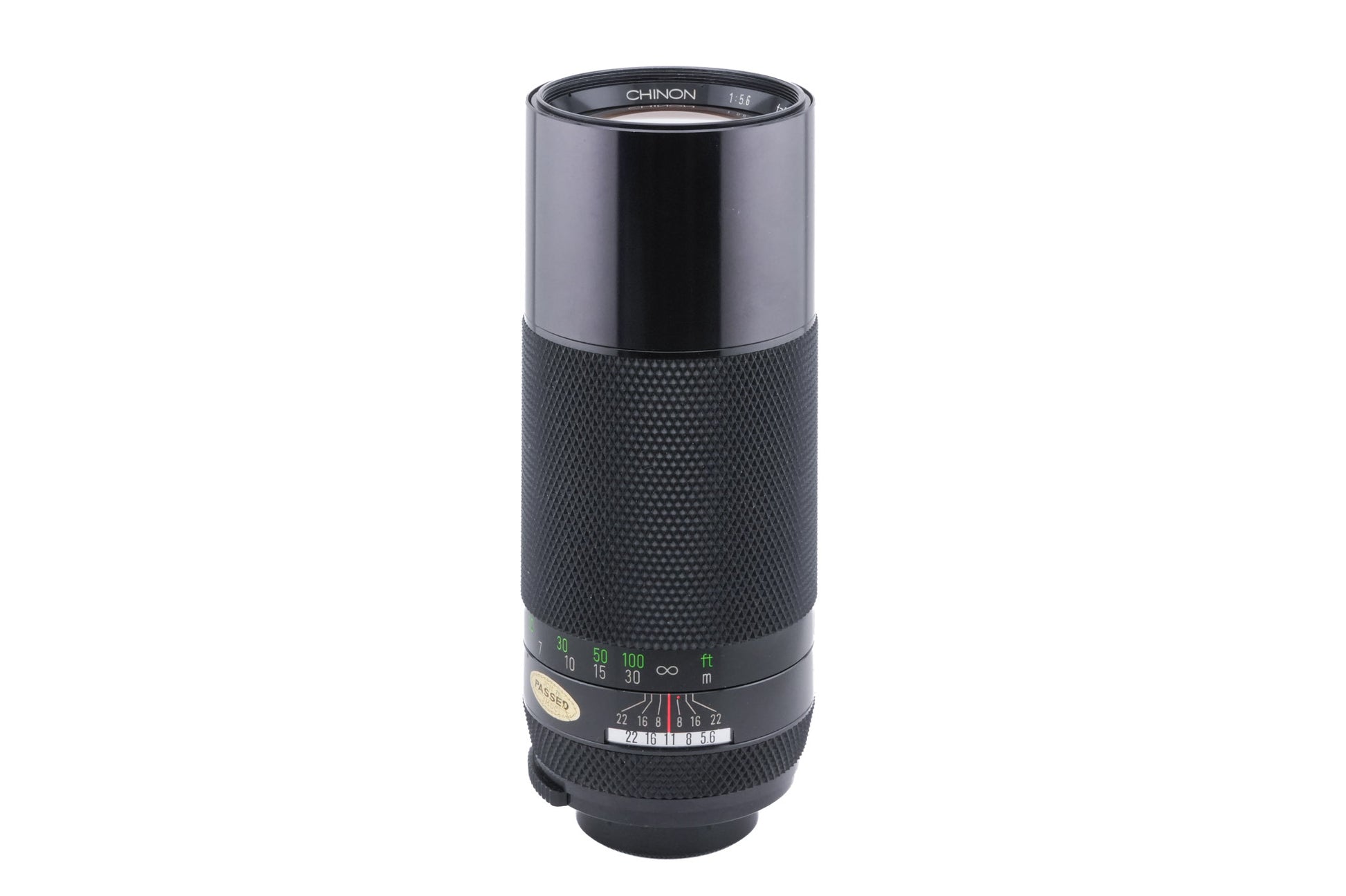 Manual focus telephoto lens made for M42-mount SLR cameras by Chinon. Metal body available in black.