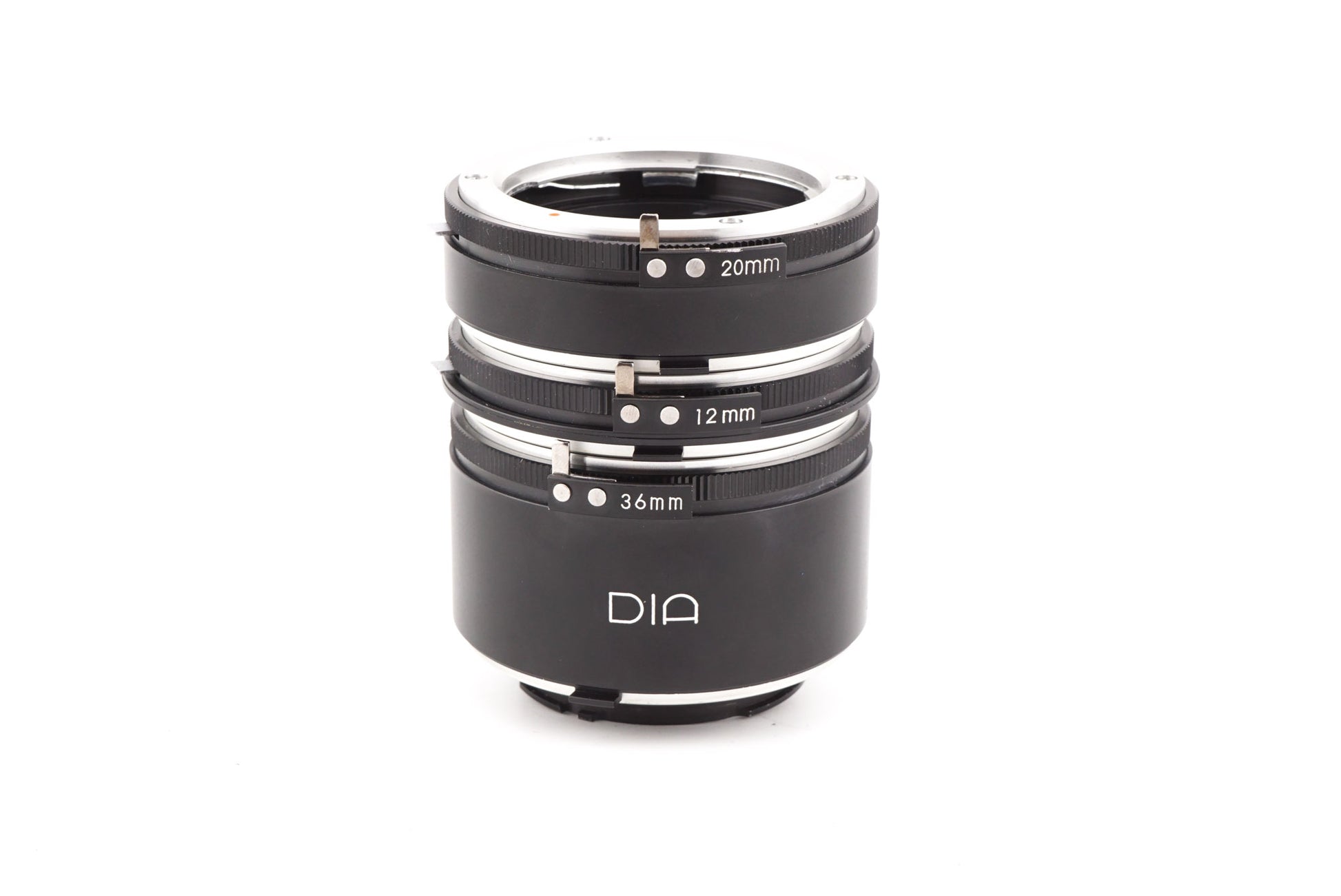 Extension tube set for Minolta MD mount lenses and cameras by DIA. 12mm, 20mm and 36mm extension tubes.