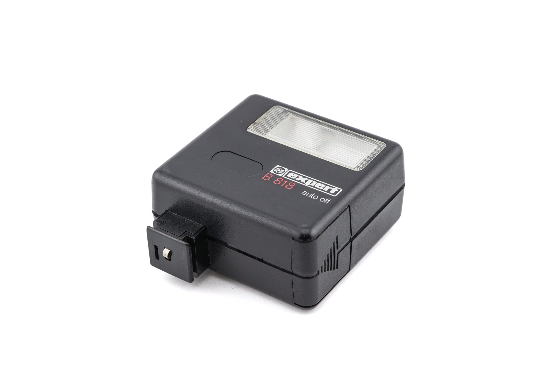 Hotshoe-mounted flash made by Expert. It has a single contact pin and a built-in PC sync cable. Plastic body available in black.