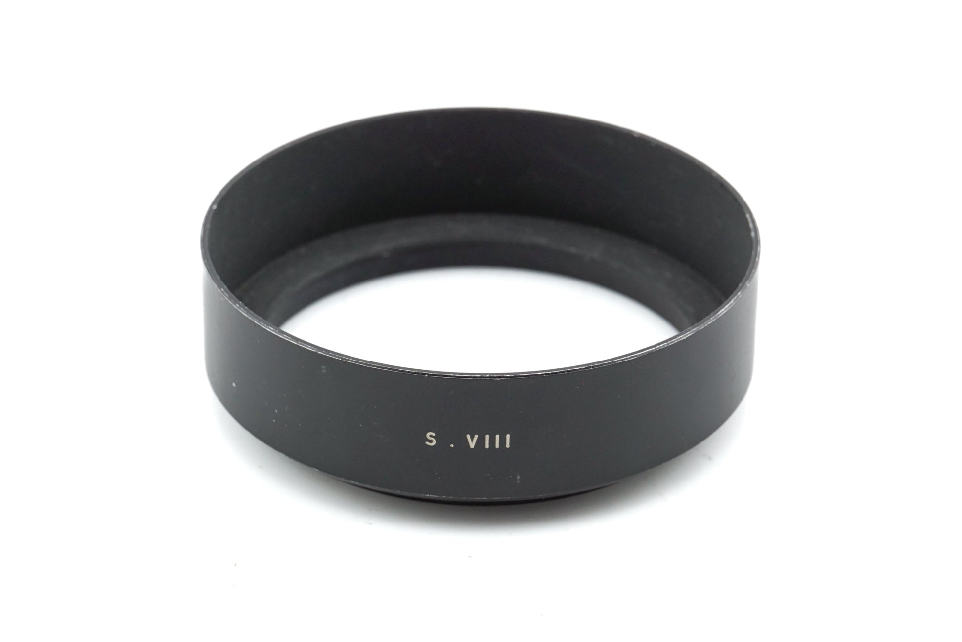 Metal lens hood that has a lip on the inside that is meant for retaining Series VIII drop-in filters.