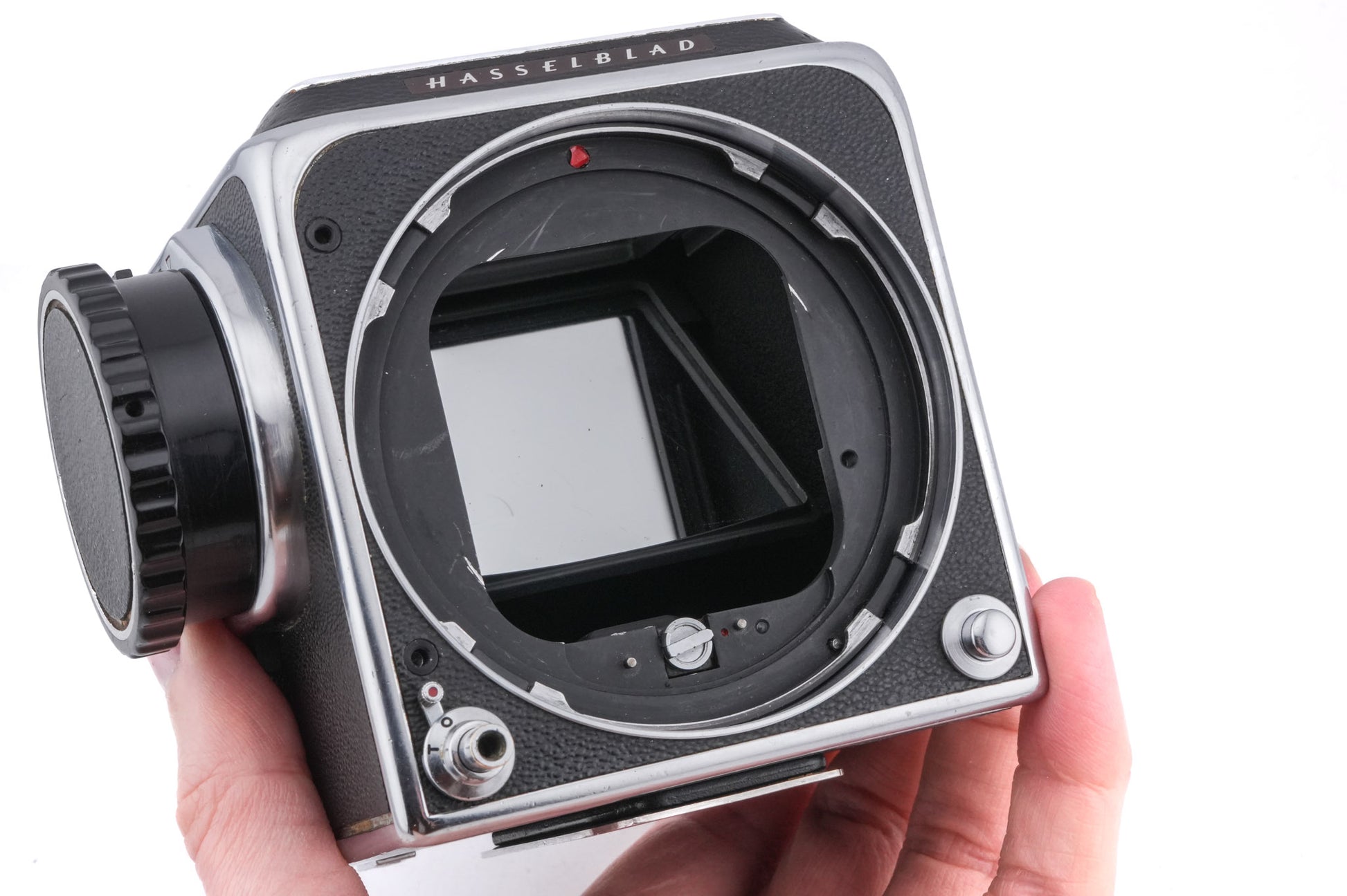 Manual focus V-mount 6x6 medium format SLR camera introduced by Hasselblad in 1957. It was the first Hasselblad camera to feature in-lens leaf shutters rather than the focal plane shutters of earlier cameras. The first design had a small pin inside the lens mount that would prevent newer CF lenses from mounting correctly. The pin was removed in the second version. This model does not have interchangeable focusing screens. Metal body available in silver.