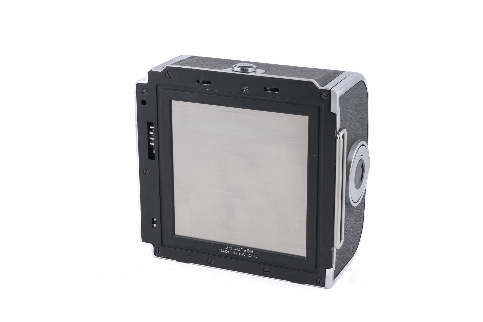 Waist-level viewfinder made for V series 120 SLR cameras by Hasselblad starting in 1984. This is the newer version with an improved opening and closing mechanism. The sides can be folded simultaneously instead of needing to be done individually. Has an interchangeable pop-up fine focus loupe. Metal body available in chrome.