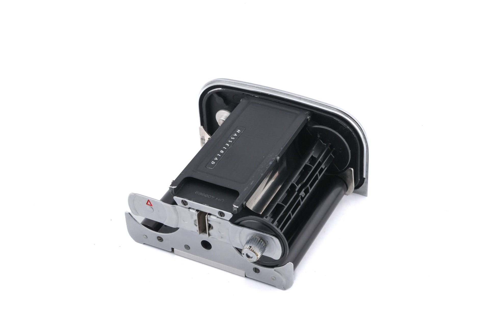 120 film magazine released for V system 120 SLRs by Hasselblad in 1968. This design improved over the previous C12 magazine by adding a winding crank to improve loading speed and an automatic system for stopping at the first frame. The back window was also removed. Exposes 12 6x6 frames on one roll of 120 film. Originally chrome, but became available in black in 1973.