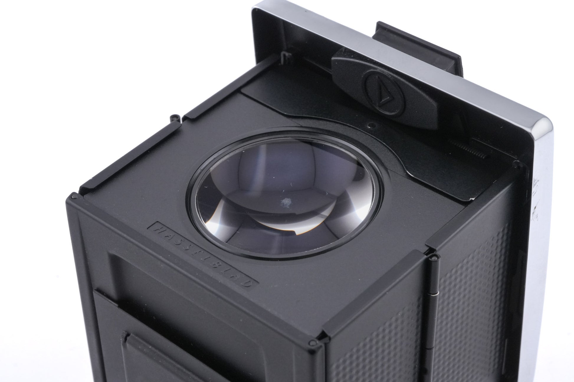 Waist-level viewfinder made for V series 120 SLR cameras by Hasselblad starting in 1984. This is the newer version with an improved opening and closing mechanism. The sides can be folded simultaneously instead of needing to be done individually. Has an interchangeable pop-up fine focus loupe. Metal body available in chrome.
