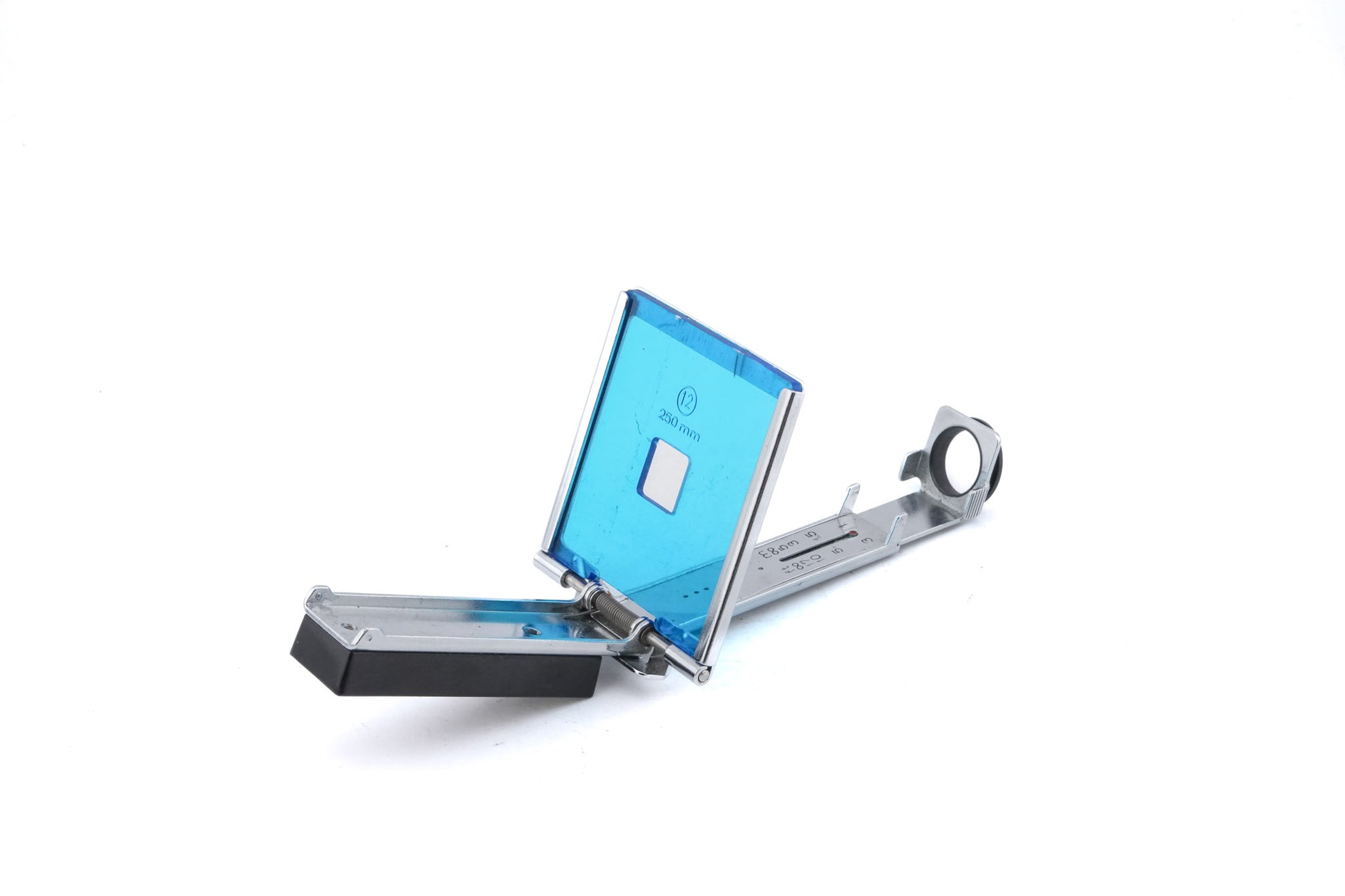 Sports viewfinder made by Hasselblad for Hasselblad V system cameras. Allowing the photographer to aim the camera and follow fast-moving subjects. This version mounts on the accessory rail on the side of the camera, and the field of view is outlined by masks that are inserted into the frame of the viewfinder which corresponds to different lenses. Metal body in silver grey finish.
