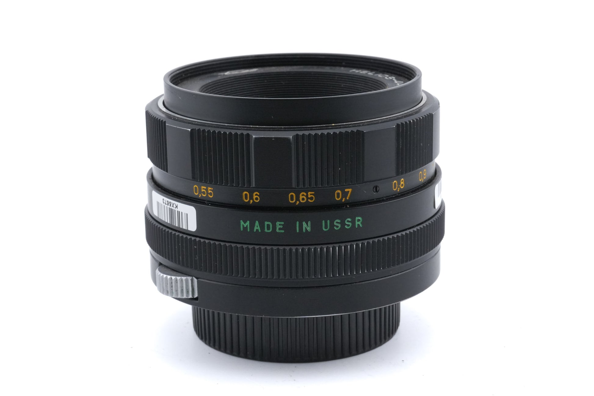 Manual focus normal lens made for M42 mount SLR cameras in the Soviet Union. Many factories made Helios lenses, including KMZ and Valdai. Metal body available in black.