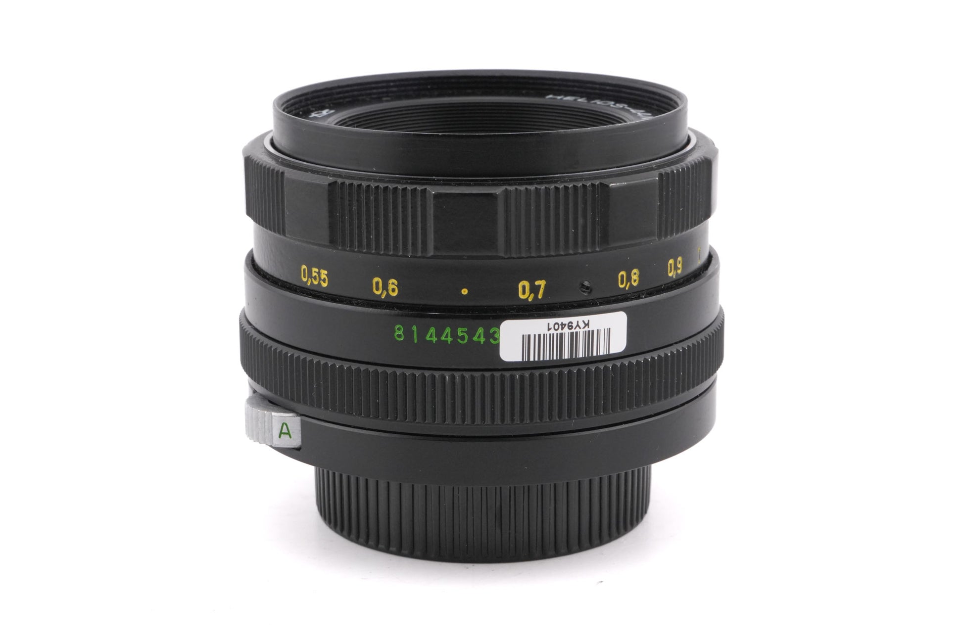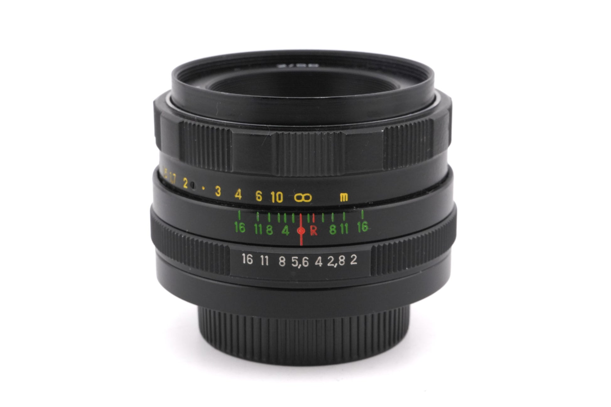 Manual focus normal lens made for M42 mount SLR cameras in the Soviet Union. Many factories made Helios lenses, including KMZ and Valdai. Metal body available in black.