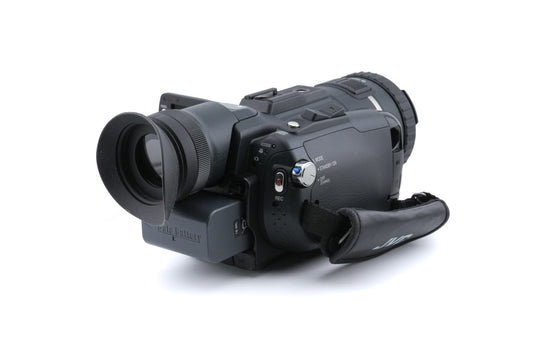 Autofocus digital handheld video camera made by JVC. Plastic body available in black.