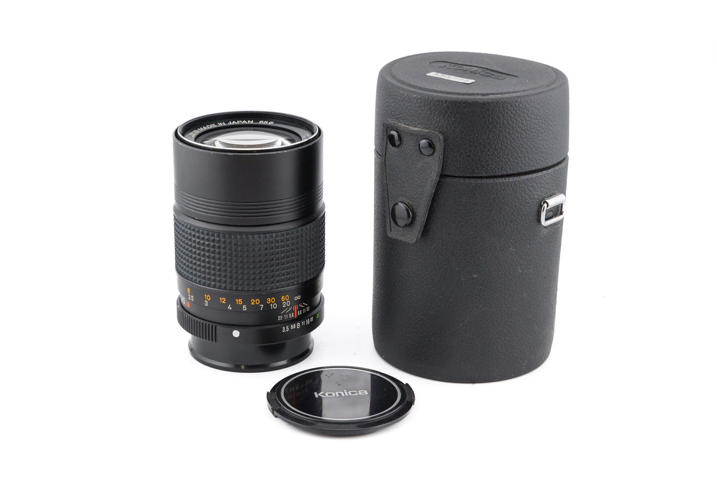 Manual focus telephoto lens made for AR-mount 35mm SLRs by Konica. The lens has an integrated lens hood. Metal body available in black.