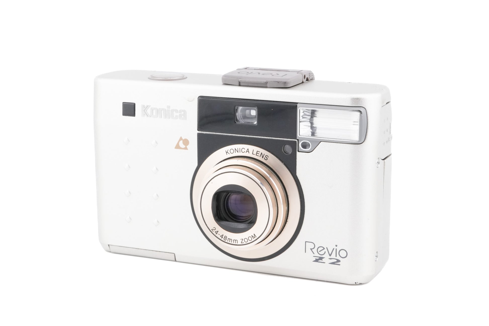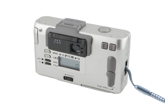 Autofocus compact APS camera made by Konica. Has a removable selfie mirror. Metal body available in silver.