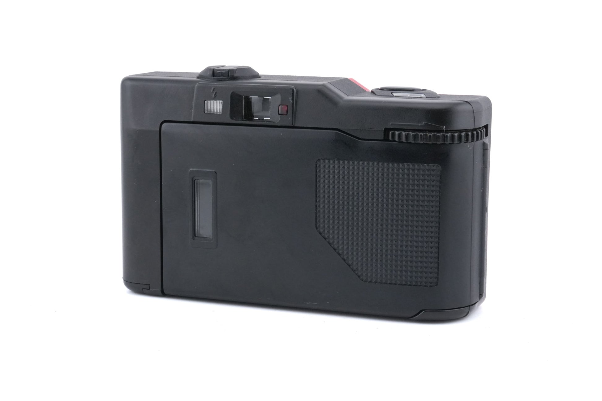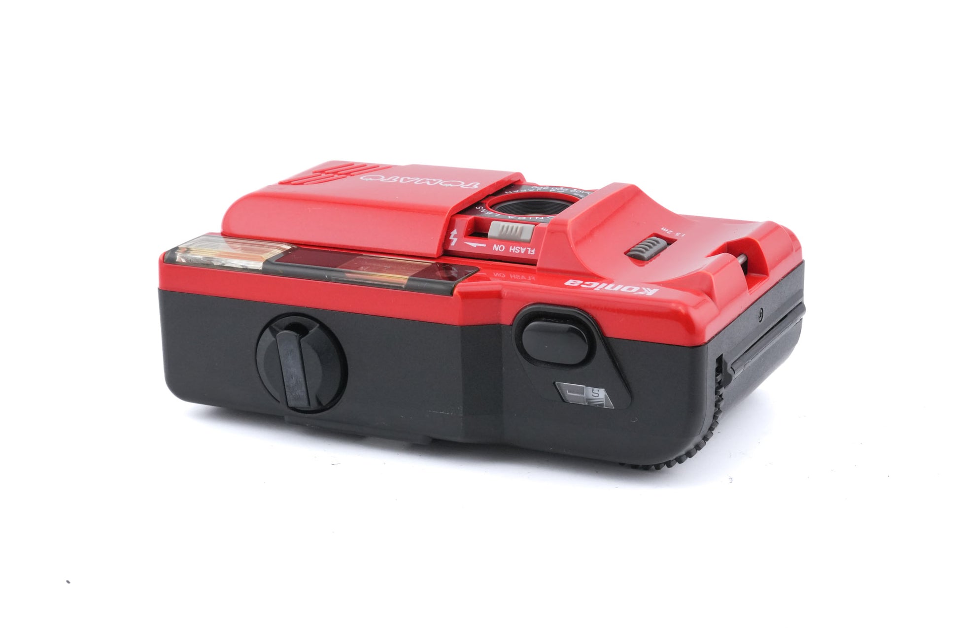 Fixed focus 35mm point-and-shoot camera released by Konica. It's essentially a red version of the Konica Pop-10. Focus is fixed at 2.8m, but a switch on the front enables taking photos at a distance of 1.5 - 2m. Plastic body available in red.