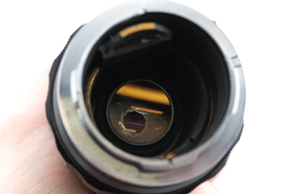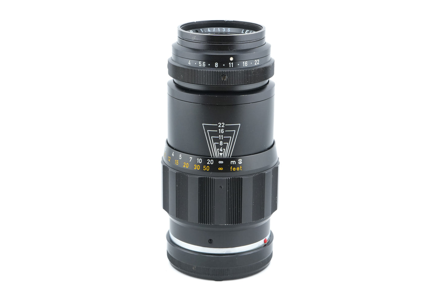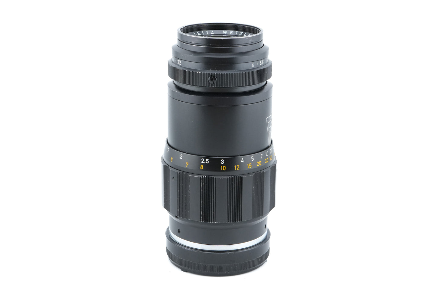 Manual focus telephoto lens made for M-mount rangefinder cameras introduced by Leica in 1965. This is the first version of the lens. It has a removable front lens head to be used with the Visoflex system. Early exaples have a wide heavily knurled focusing ring while later ones have a more fine knurled design. On early examples a black ring is attached around the rear element group that must be removed if the lens is to be used with the Visoflex. The ring was removed on later models. Metal body available in black (11851).