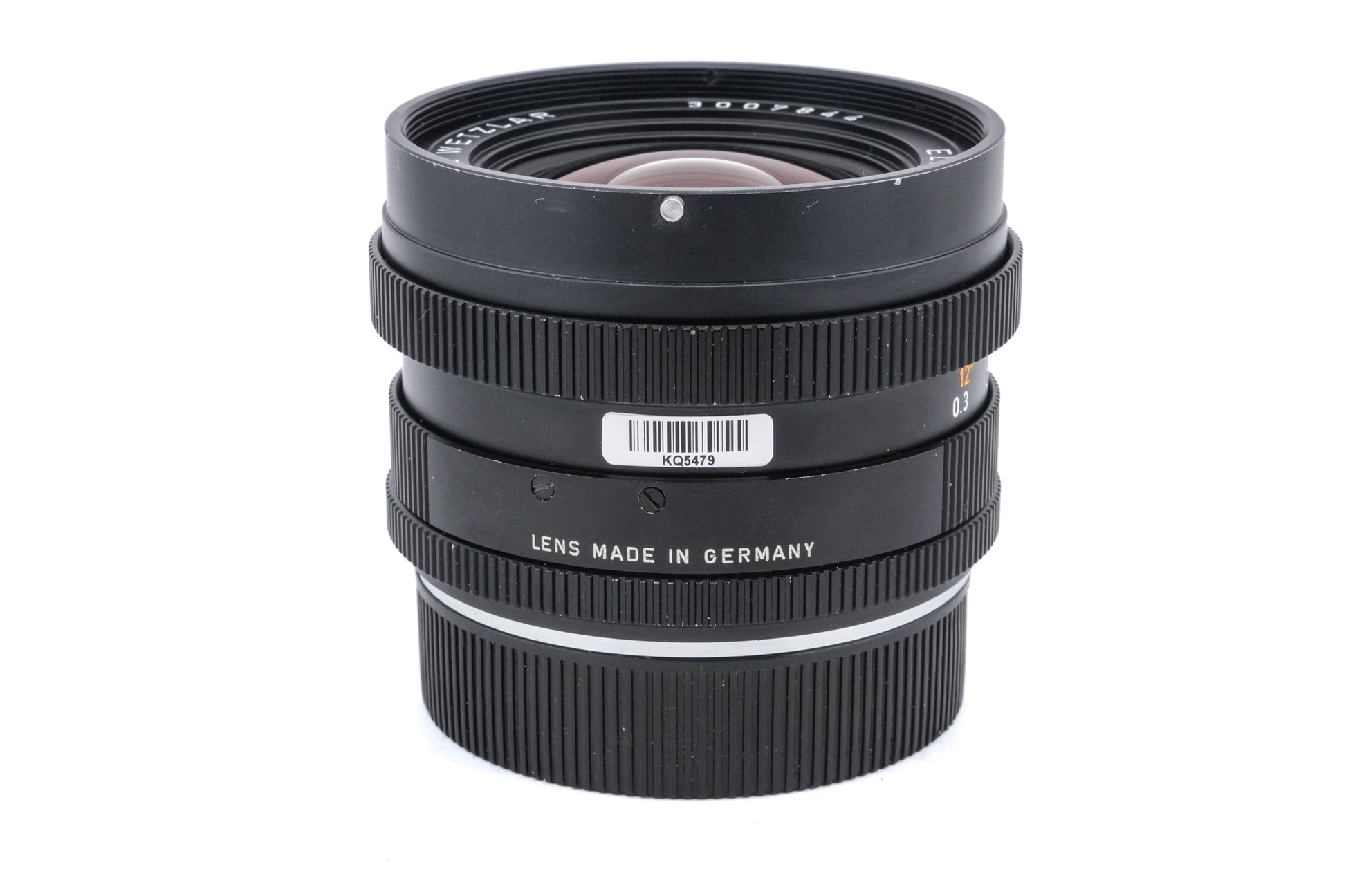 Manual focus wide-angle lens made for R-mount 35mm SLR cameras introduced by Leica in 1974. The optical formula was designed by Minolta. It uses a floating elements design to ensure optimal performance throughout the entire focusing range. This lens has a 3-Cam mount. 3-Cam lenses have two sloped cams and a third stepped cam and are compatible with all Leicaflex and R-series cameras. Metal body available in black (11221).