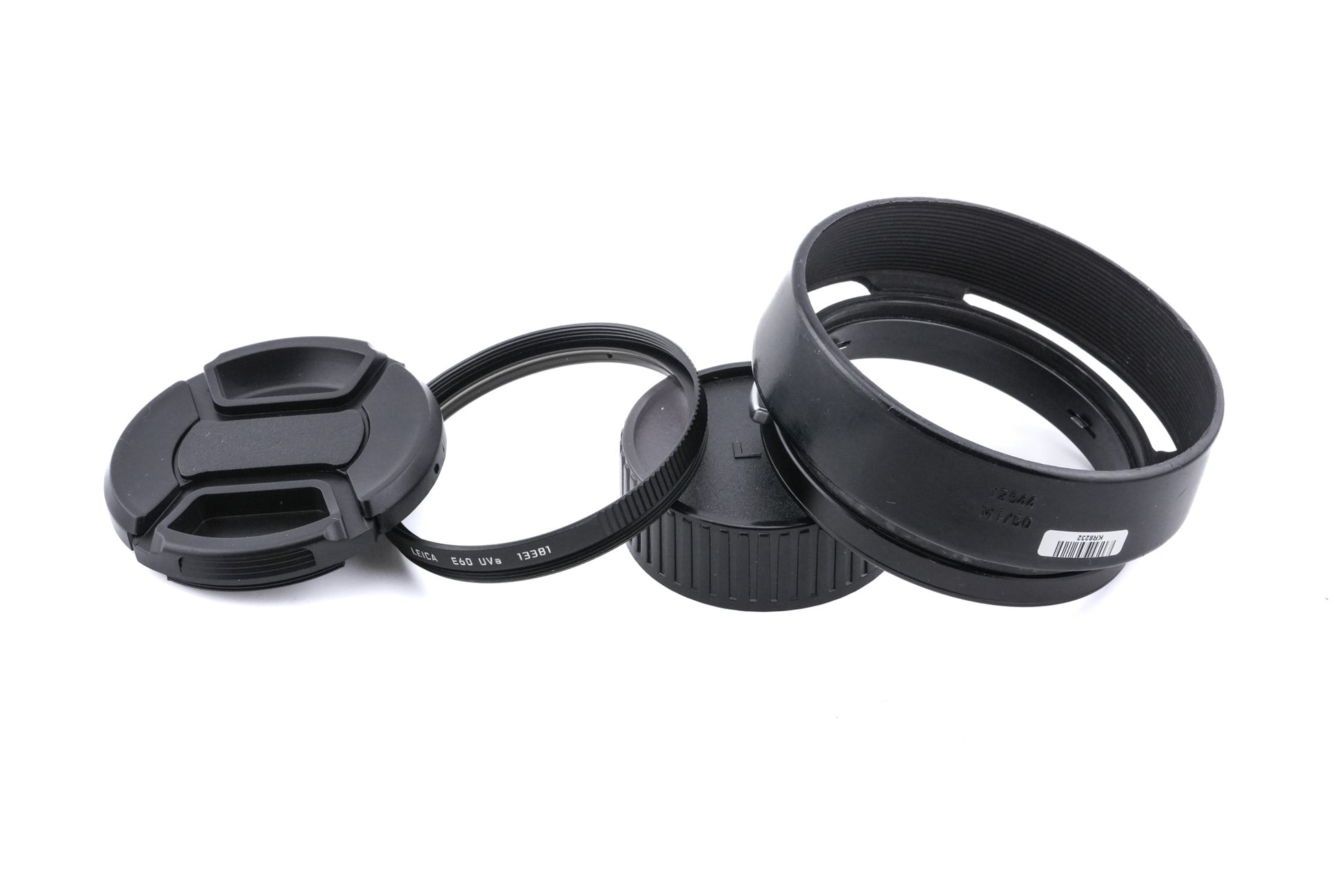 Manual focus normal lens made for M-mount rangefinder cameras introduced by Leica in 1982. Leica made four versions of this lens that all differ in filter and lens hood usage. This is the third version of the lens that uses E60 filters and lens hood 12544. The four versions were produced between 1976 and 2008. Metal body available in black.