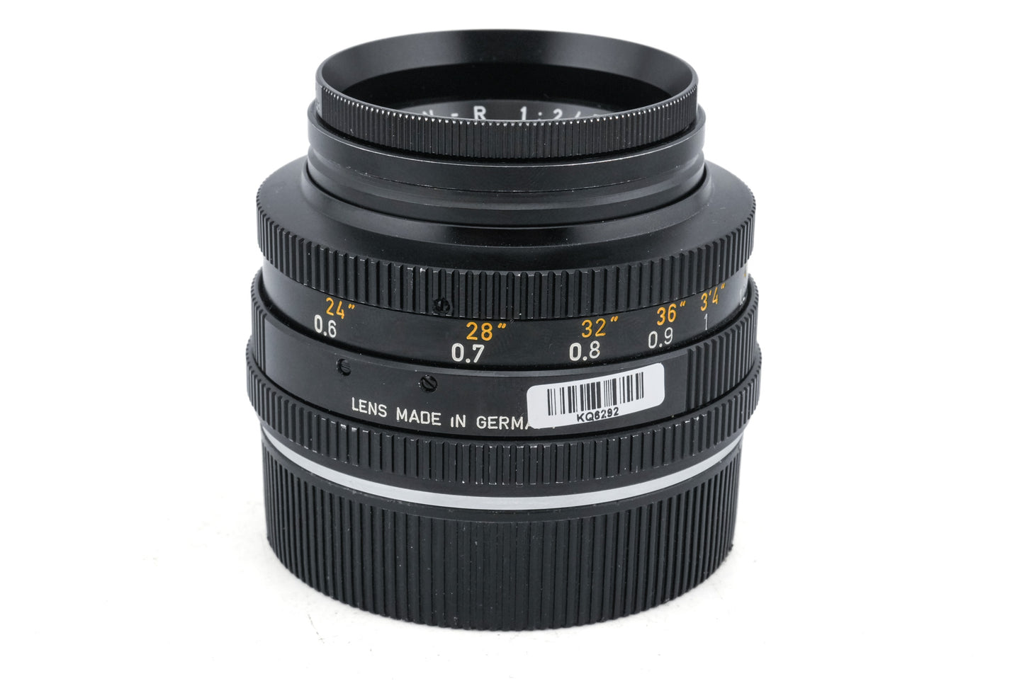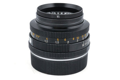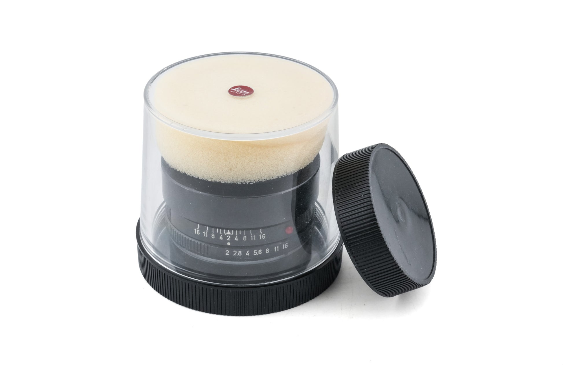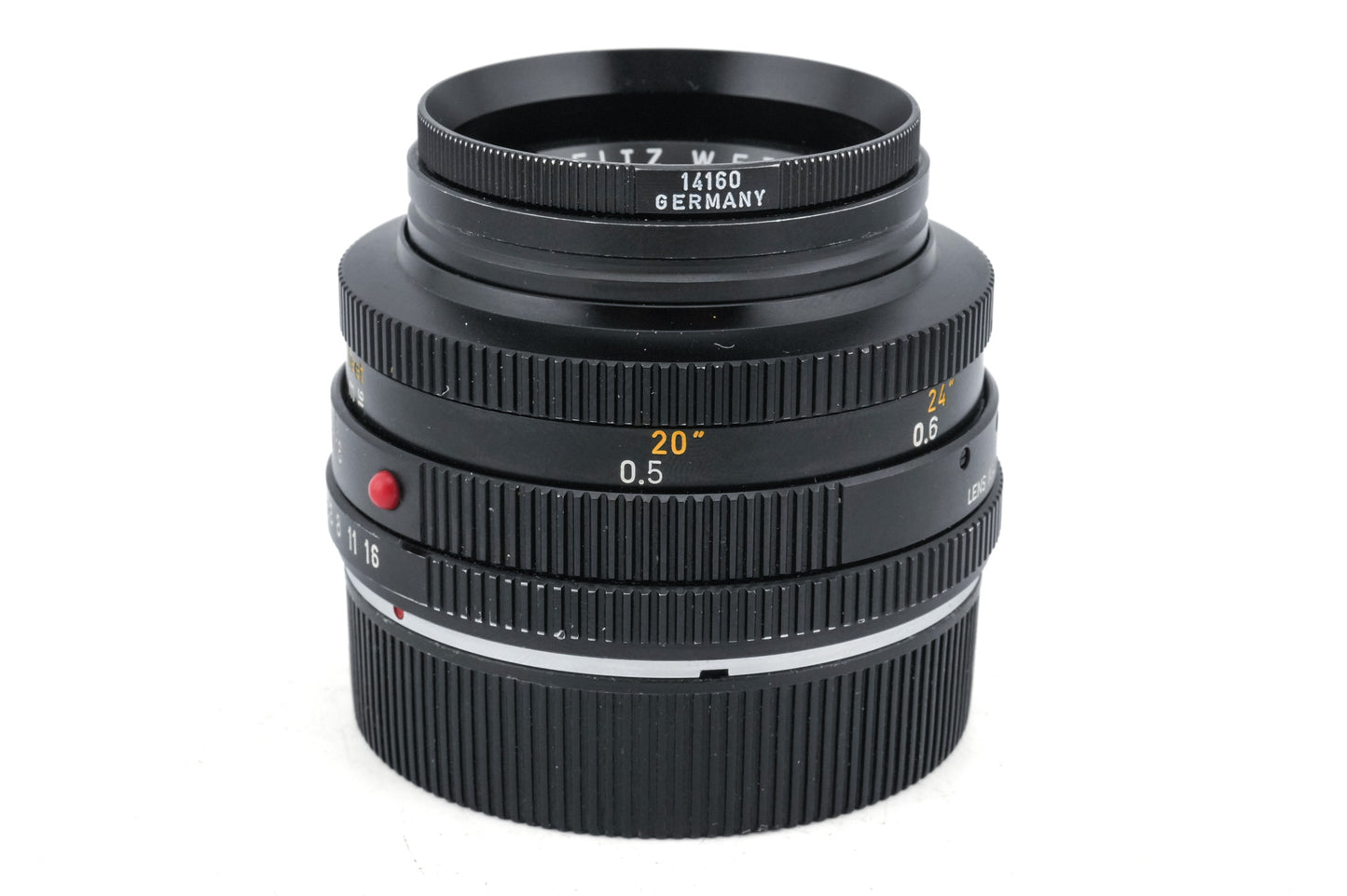 Manual focus normal lens made for R-mount 35mm SLR cameras introduced by Leica in 1964. It was initially released in silver, but this was quickly changed to black. Only 200-300 silver lenses were ever manufactured. This lens has a 2-Cam mount. 2-Cam lenses have two sloped cams and are compatible with the standard Leicaflex and R-series cameras in stop-down metering mode only. They are not recommended to be used on the R8/R9. Metal body available in black (11228).