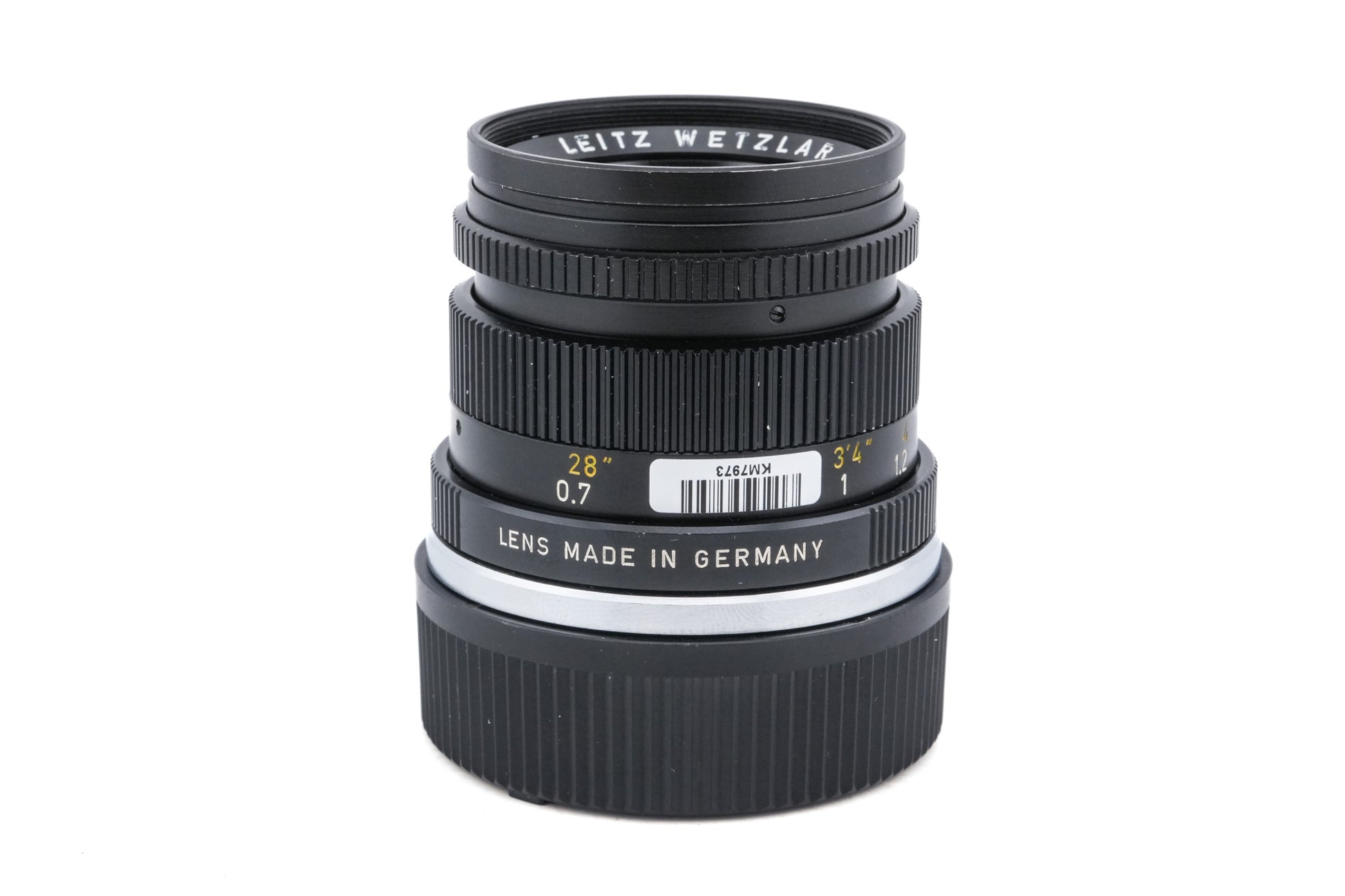 Manual focus normal lens made for M-mount rangefinder cameras introduced by Leica in 1969. Leica made many different versions of the 5cm f2 Summicron that differ in both design and optical formula. This is the third model of the lens. The optical formula changed from 7 elements to 6, and it was advertised as a lightweight version without the infinity lock on the focusing mount. The early examples still have the scalloped focusing ring as seen on the previous versions, but later examples changed to a finer, even knurling. Metal body available in black.