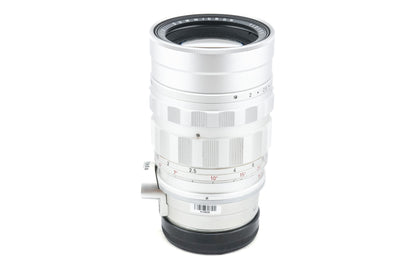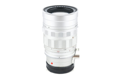 Manual focus telephoto lens made for M-mount rangefinder cameras introduced by Leica in 1957. Leica made many versions of the 9cm/90mm f2 Summicron. This is the first version of the lens. The lens is identical to the LTM M39 version (SOOZI), but for the M system. It uses the removable lens hood HMOOD (12527). It has a factory-fitted screw-to-bayonet adapter, indicating that the lens was built upon the chassis of the LTM M39 mount version. The lens was produced in Canada, but a few early production lenses (about 200, made as early as 1953) were assembled in Germany. Metal body available in silver (11127).