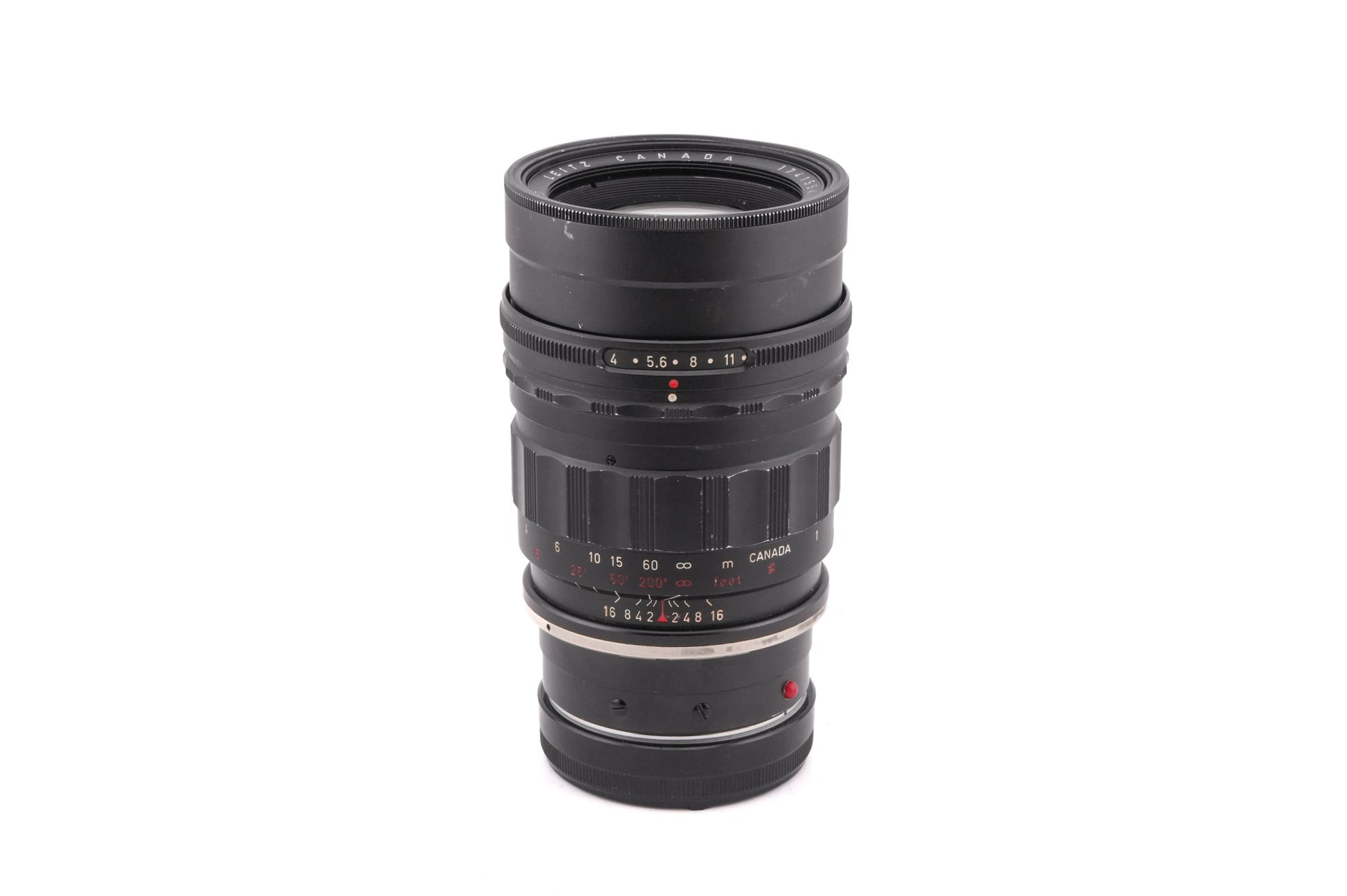 Manual focus telephoto lens made for M-mount rangefinder cameras introduced by Leica in 1959. Leica made many versions of the 9cm/90mm f2 Summicron. This is a variation of the second version of the lens with a preset aperture. It was designed specifically for the Visoflex system and was only available as a special-order lens. It has a removable lens head that could be used together with the ZOOEP / 16463 short focus mount on the Visoflex II, IIa, and III. Metal body available in black (INVOO / 00001).