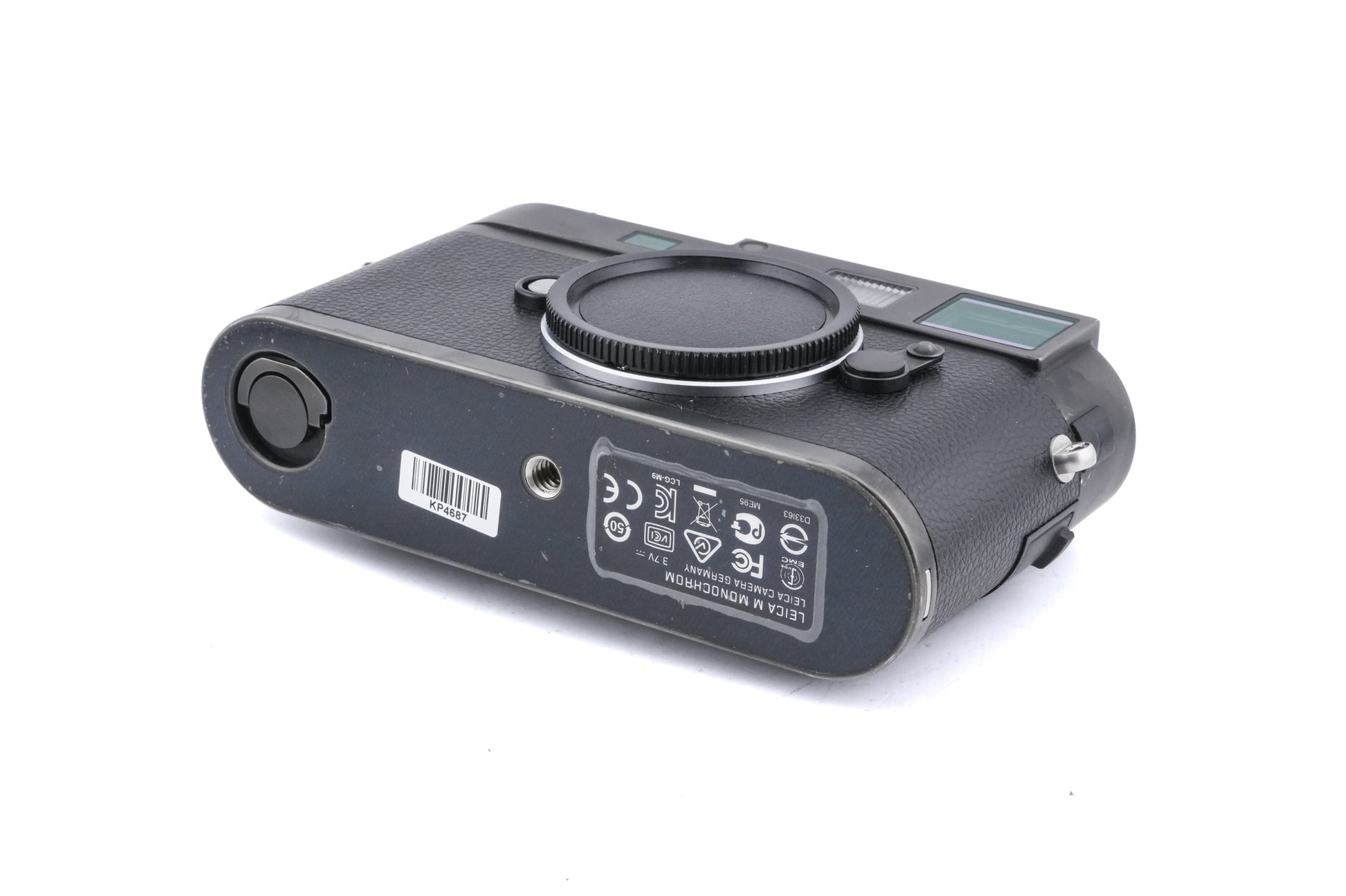 Manual focus full-frame M-mount digital rangefinder camera introduced by Leica in 2012. The M Monochrom is similar to the M9 but has a monochromatic black and white sensor with no color filter array. This allows it to capture more of the available light with greater detail, but it cannot perceive color. Software for three-tone coloring of the files is included with the purchase of the camera. It has a 2.5” rear LCD and uses SD cards for storage. The viewfinder has a magnification of 0.68x and framelines for 35/135mm, 28/90mm, and 50/75mm. Metal body available in black (10760).