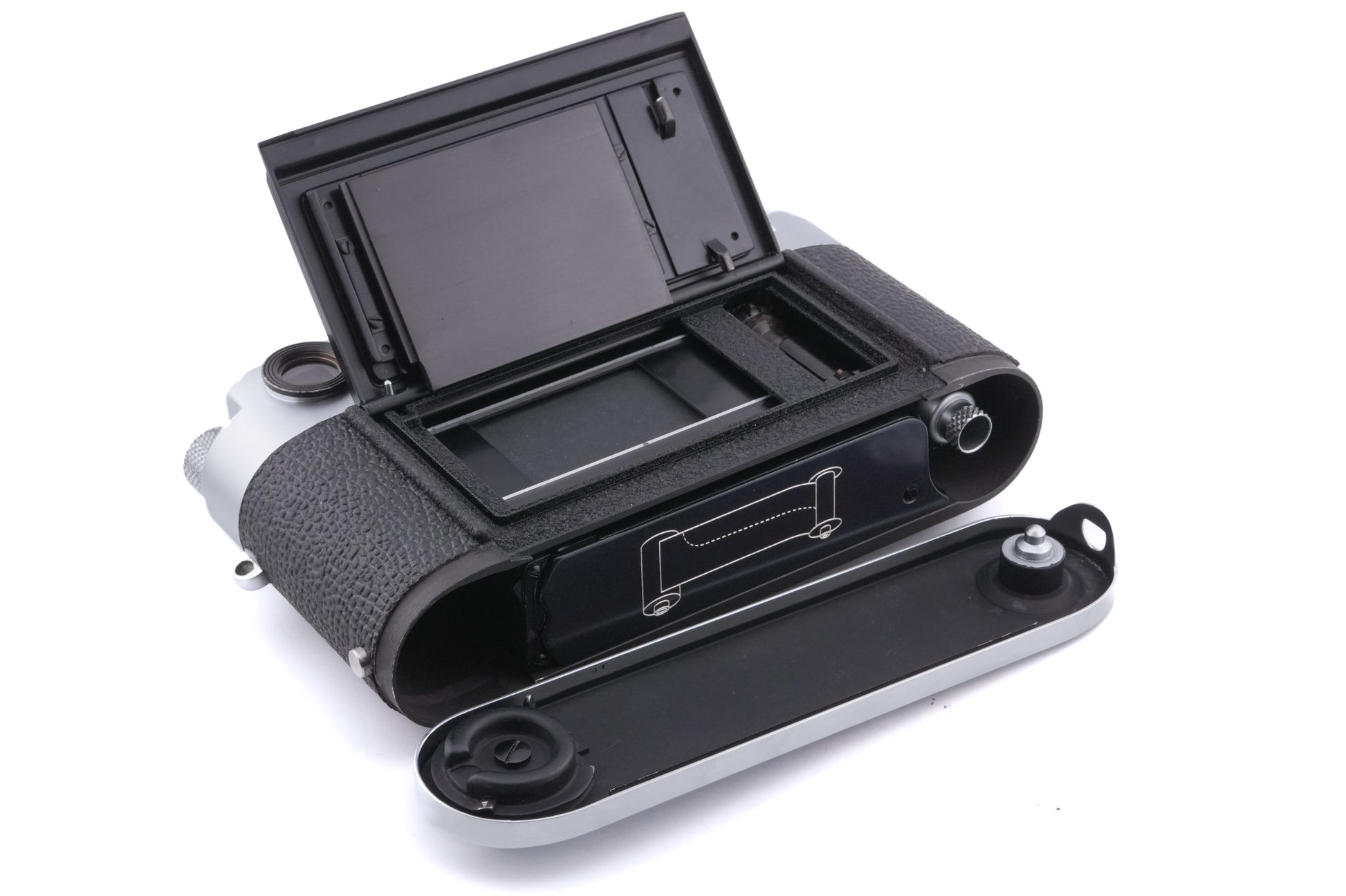 Manual focus M-mount 35mm viewfinder camera introduced by Leica in 1959. It resembles the M2 but lacks the self-timer, rangefinder, field frame selector, and 90mm frame lines. The viewfinder has framelines for 35mm and 50mm lenses. The M1 experienced variation in design over the production period. Early cameras used a button for the rewind engagement, whereas later models changed to a lever. The "M1" logo is usually on the front of the camera, but is sometimes seen on top. Some special versions of the M1 without a viewfinder were also produced. Metal body available in silver (KOOCT / 10120).
